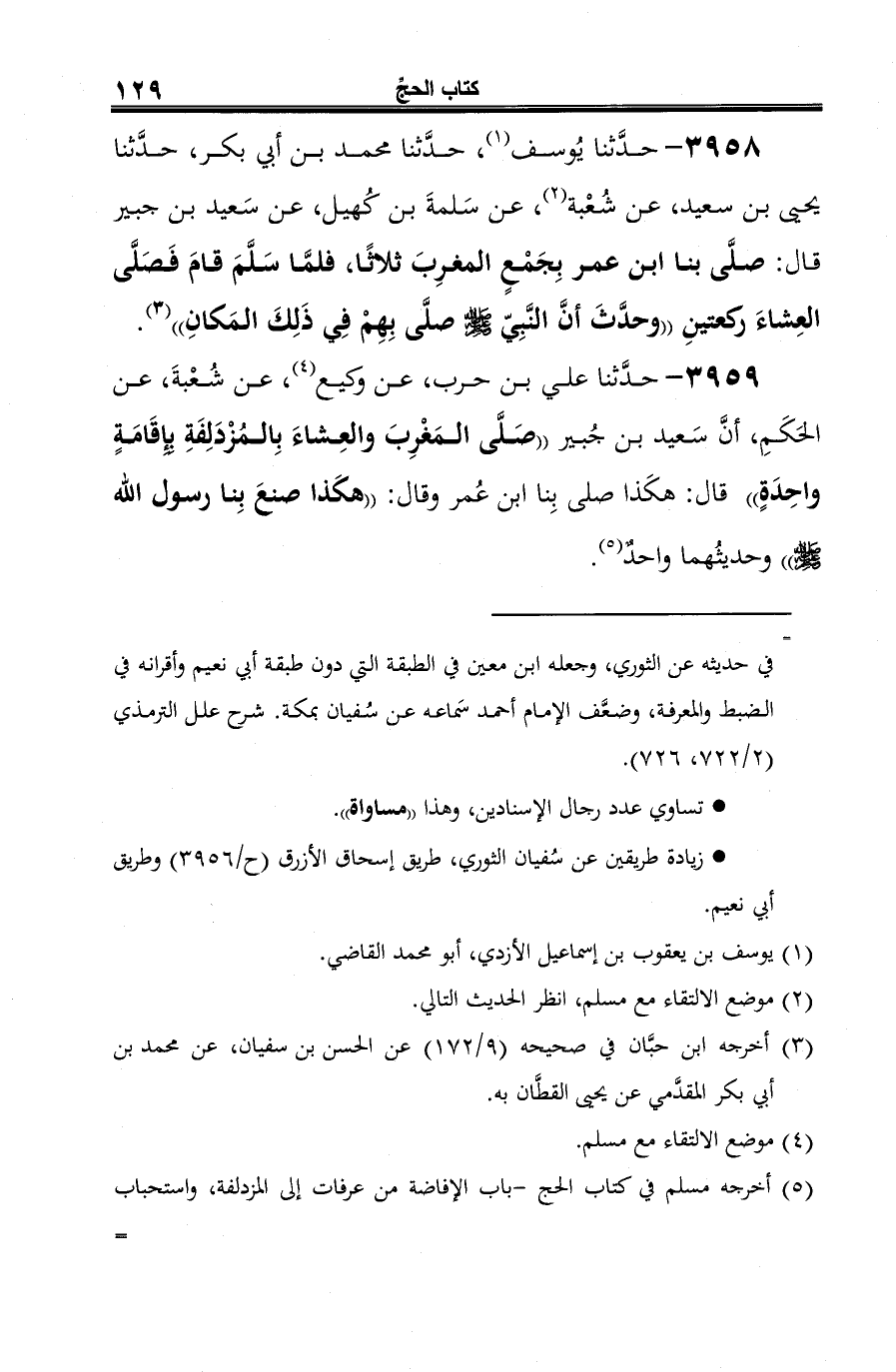 3958 - حدَّثنا يُوسف (¬1)، حدَّثنا محمد بن أبي بكر، حدَّثنا يحيى بن سعيد، عن شُعْبة (¬2)، عن سَلمةَ بن كُهيل، عن سَعيد بن جبير قال: صلَّى بنا ابن عمر بِجَمْعٍ المغرِبَ ثلاثًا، فلمَّا سَلَّمَ قامَ فَصَلَّى العِشاءَ ركعتينِ "وحدَّثَ أنَّ النَّبِيّ -صلى الله عليه وسلم- صلَّى بِهِمْ في ذَلِكَ المَكانِ" (¬3).