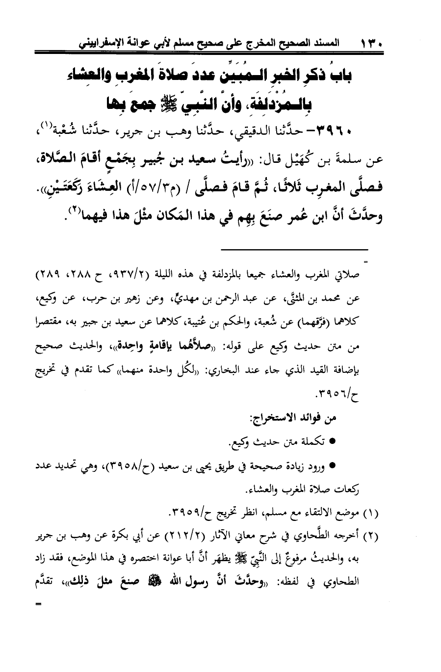 3960 - حدَّثنا الدقيقي، حدَّثنا وهب بن جرير، حدَّثنا شُعْبة (¬1)، عن سلمةَ بن كُهَيْل قال: "رأيتُ سعيد بن جُبير بِجَمْعٍ أقامَ الصَّلاة، فصلَّى المغرِب ثَلاثًا، ثُمَّ قامَ فصلَّى العِشَاءَ ركعَتَيْنِ". وحدَّثَ أنَّ ابن عُمر صنَعَ بِهِم في هذا المَكان مثْلَ هذا فيهما (¬2).
