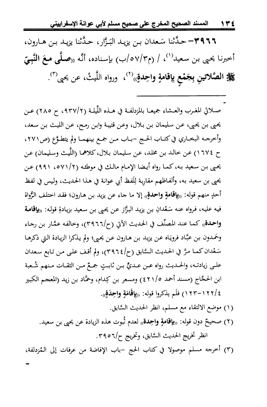 3966 - حدَّثنا سَعدان بن يزيد البَزَّار، حدَّثنا يزيد بن هارون، أخبرنا يحيى بن سعيد (¬1)، بإسناده، أنَّه "صلَّى معَ النَّبِيّ -صلى الله عليه وسلم- الصَّلاتينِ بِجَمْعٍ بِإقامةٍ واحِدةٍ" (¬2)، ورواه اللَّيثُ، عن يحيى (¬3).