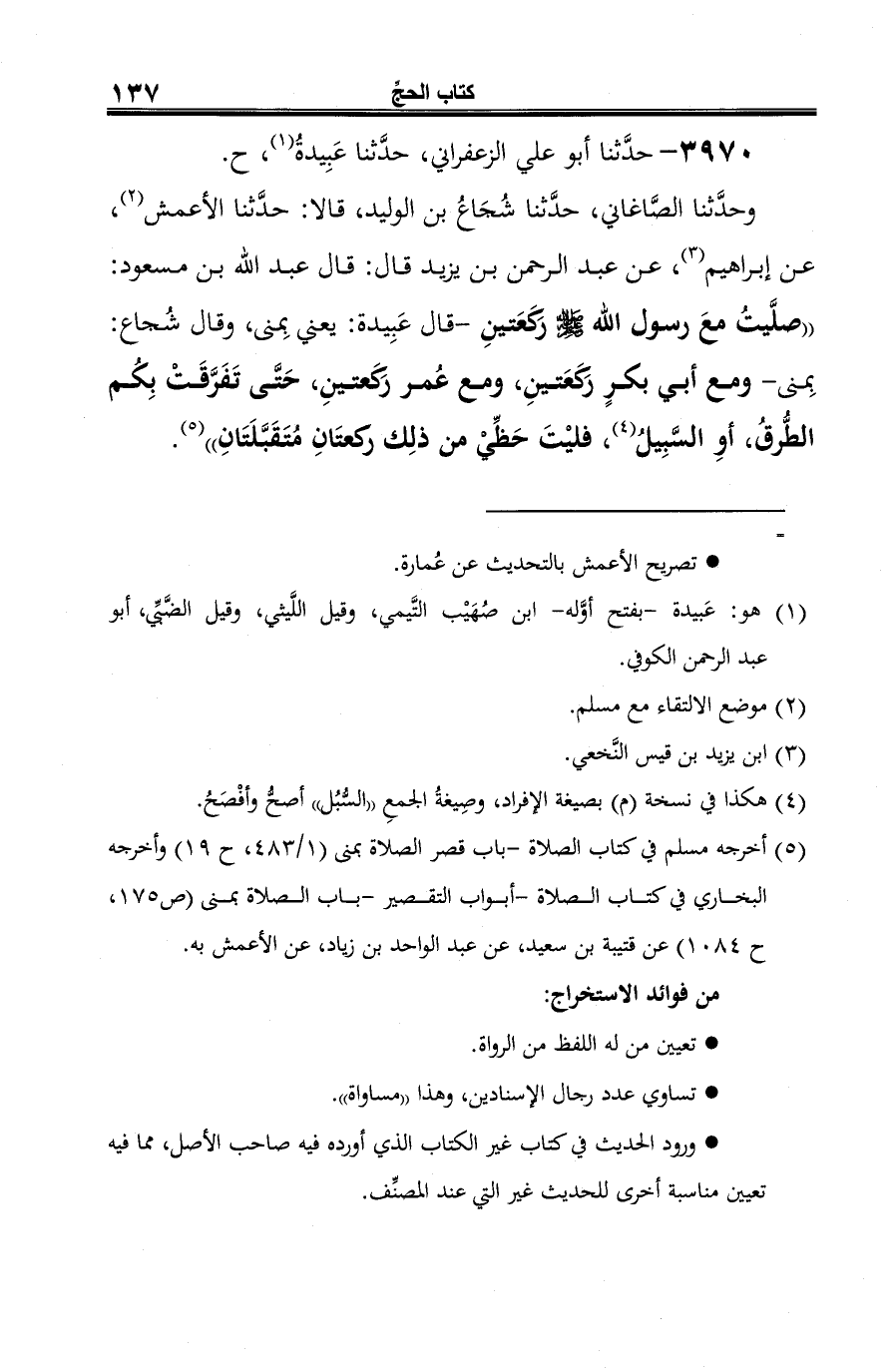 (¬5) أخرجه مسلم في كتاب الصلاة -باب قصر الصلاة بمنى (1/ 483، ح 19) وأخرجه البخاري في كتاب الصلاة- أبواب التقصير -باب الصلاة بمنى (ص 175، ح 1084) عن قتيبة بن سعيد، عن عبد الواحد بن زياد، عن الأعمش به.