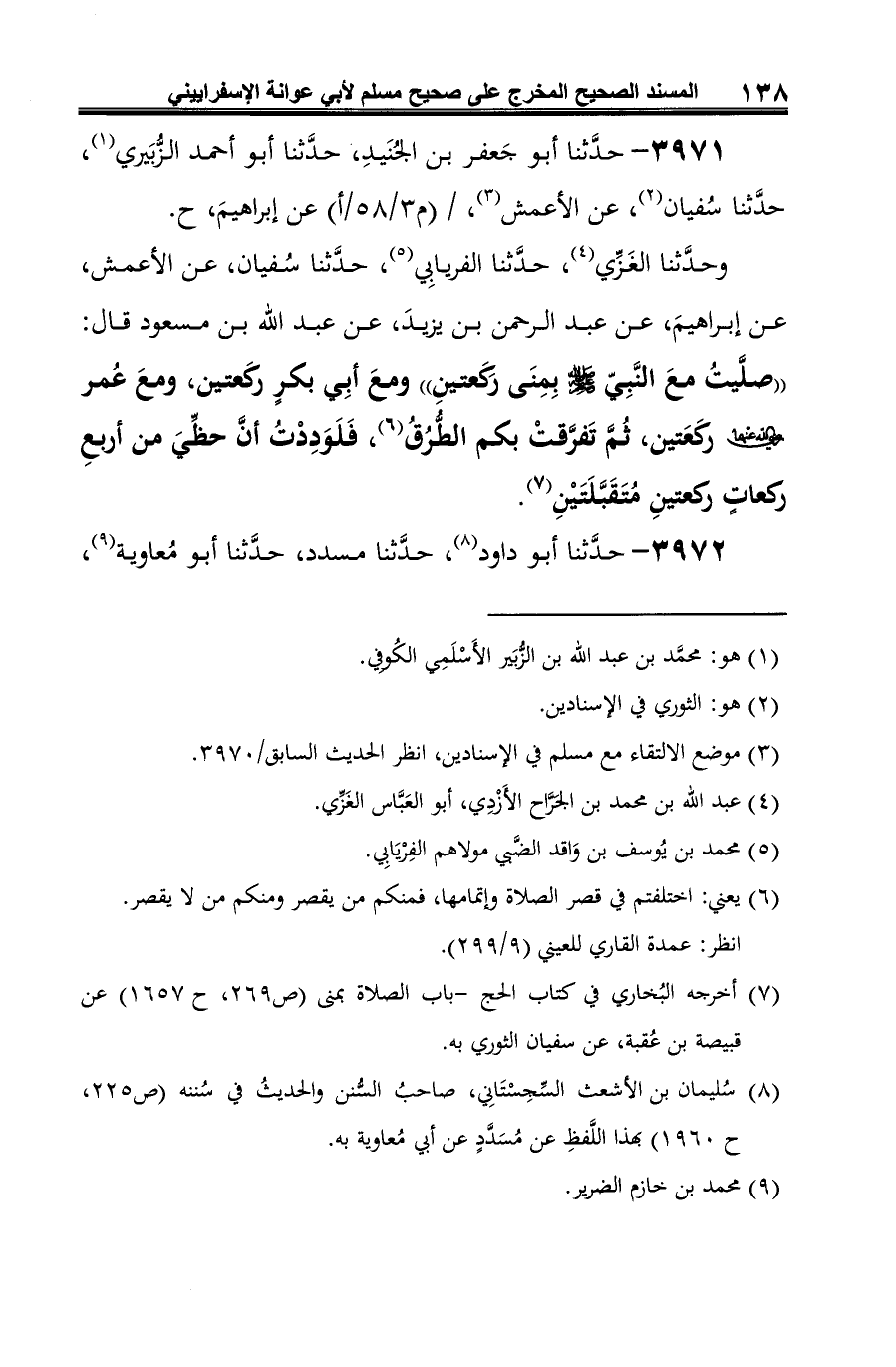 وحديث أبي عوانة صحيح دون الزِّيادة الأَخِيرة، فقد جاء في إسنادها مبهمون لم أتمكَّن من تعيينهم ثُمَّ الوقُوفِ على أحوالهم، ولكنَّها ثبتت من طُرقٍ أُخرى مسندة إلى عبد الله بن مسعود، فأخرجها البيهقي في السُّنن الكبرى (3/ 144) بإسناد صحيح عن عبد الله بن يوسف الأصبهاني، عن عبد الله بن محمد بن إسحاق الفاكهي، عن ابن أبي مسرة، عن خلَّاد بن يحيى، عن يُونس بن أبي إسحاق عن أبي إسحاق، عن عبد الرحمن بن يزيد النخعي به، وأخرجه معرفة السُّنن والآثار (2/ 426) بإسناده عن الربيع بن سُليمان، عن الشافعي فيما بلغه عن أبي معاوية، عن الأعمش به، ونقل عقبه عن الإمام أحمد أنَّه قال: "وقد روينا بإسناد صحيح عن أبي إسحاق، عن عبد الرحمن بن يزيد في صلاةٍ ابن مسعود أربعا، وقولهم: ألم يحدِّثنا أنَّ النَّبيّ -صلى الله عليه وسلم- صلَّى ركعتين، وأبا بكر؟ فقال: بلى، ولكنَّ عثمانَ كان إمامًا، فأخالفُه والخلافُ شرٌّ". =