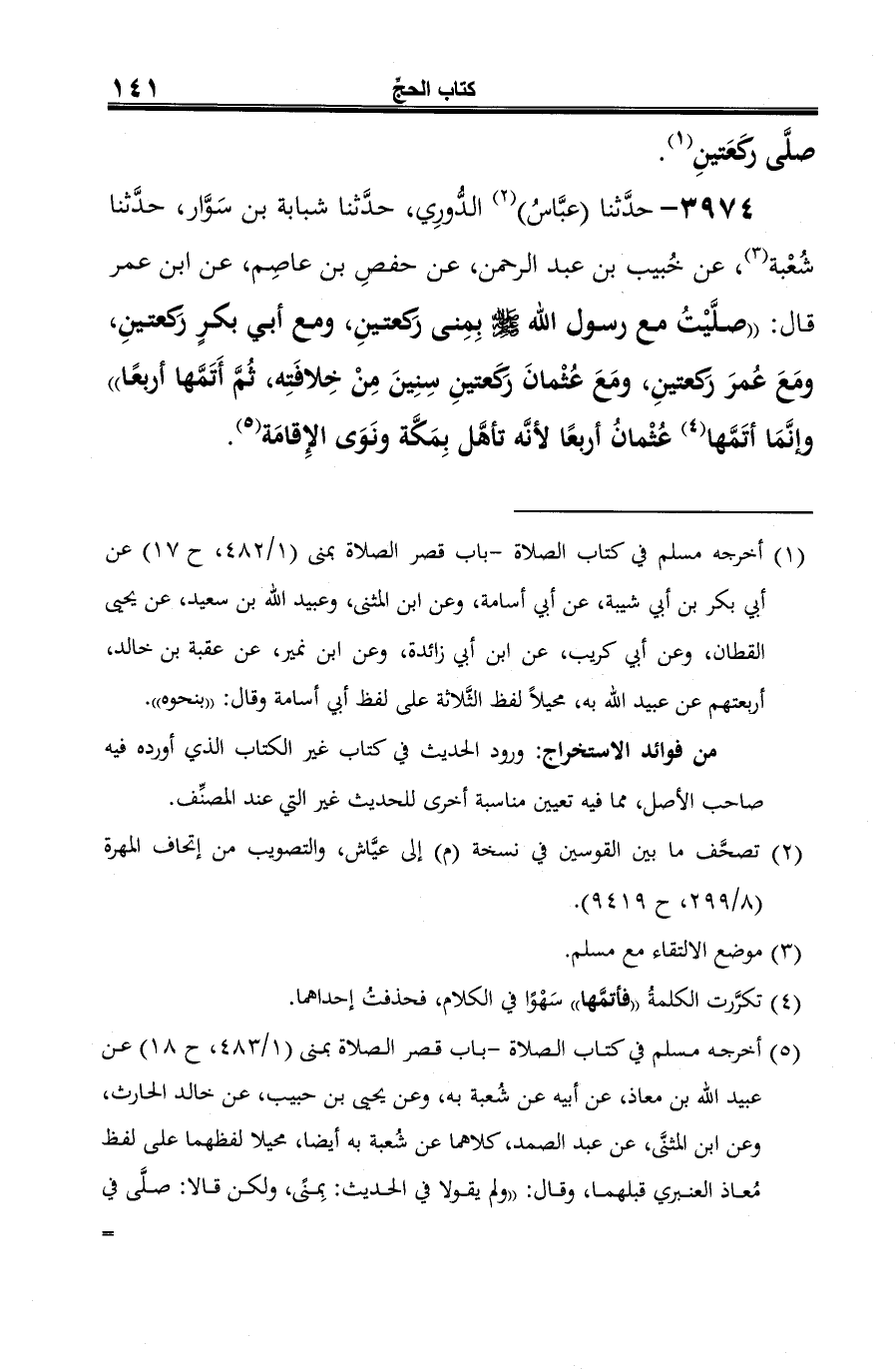 3974 - حدَّثنا (عبَّاسُ) (¬1) الدُّورِي، حدَّثنا شبابة بن سَوَّار، حدَّثنا شُعْبة (¬2)، عن خُبيب بن عبد الرحمن، عن حفصِ بن عاصِم، عن ابن عمر قال: "صلَّيْتُ مع رسول الله -صلى الله عليه وسلم- بِمِنى ركعتينِ، ومع أبي بكرٍ ركعتينِ، ومَعَ عُمرَ ركعتينِ، ومَعَ عُثْمانَ ركعتينِ سِنِينَ مِنْ خِلافَتِه، ثُمَّ أَتَمَّها أربعًا" وإنَّمَا أتَمَّها (¬3) عُثْمانُ أربعًا لأنه تأهَّل بِمَكَّة ونَوَى الإِقامَة (¬4).