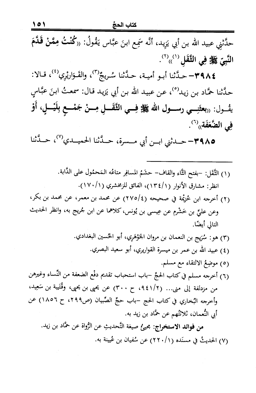 (¬4) أخرجه مسلم في كتاب الحجِّ -باب استحباب تقديم دفْع الضعفة من النِّساء وغيرهن من مزدلفة إلى منى ... (2/ 941، ح 300) عن يحيى بن يحيى، وقُتَيبة بن سَعِيد، وأخرجه البُخاري في كتاب الحج -باب حجِّ الصِّبيان (ص 299، ح 1856) عن أبي النُّعمان، ثلاثتُهم عن حمَّاد بن زيد به.