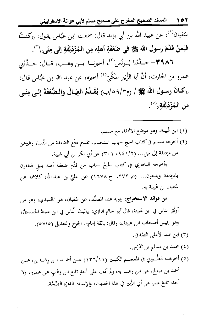 3986 - حدَّثنا يُونس (¬1)، أخبرنا ابن وهب، قال: حدَّثني عمرو بن الحارث، أنَّ أبا الزُّبَير المكِّي (¬2) أخبرَه، عن عبد الله بن عبَّاس قال: "كانَ رسول الله -صلى الله عليه وسلم- يُقَدِّمُ العِيَالَ والضَّعَفَةَ إلى مِنَى من المُزْدَلِفَةِ" (¬3).