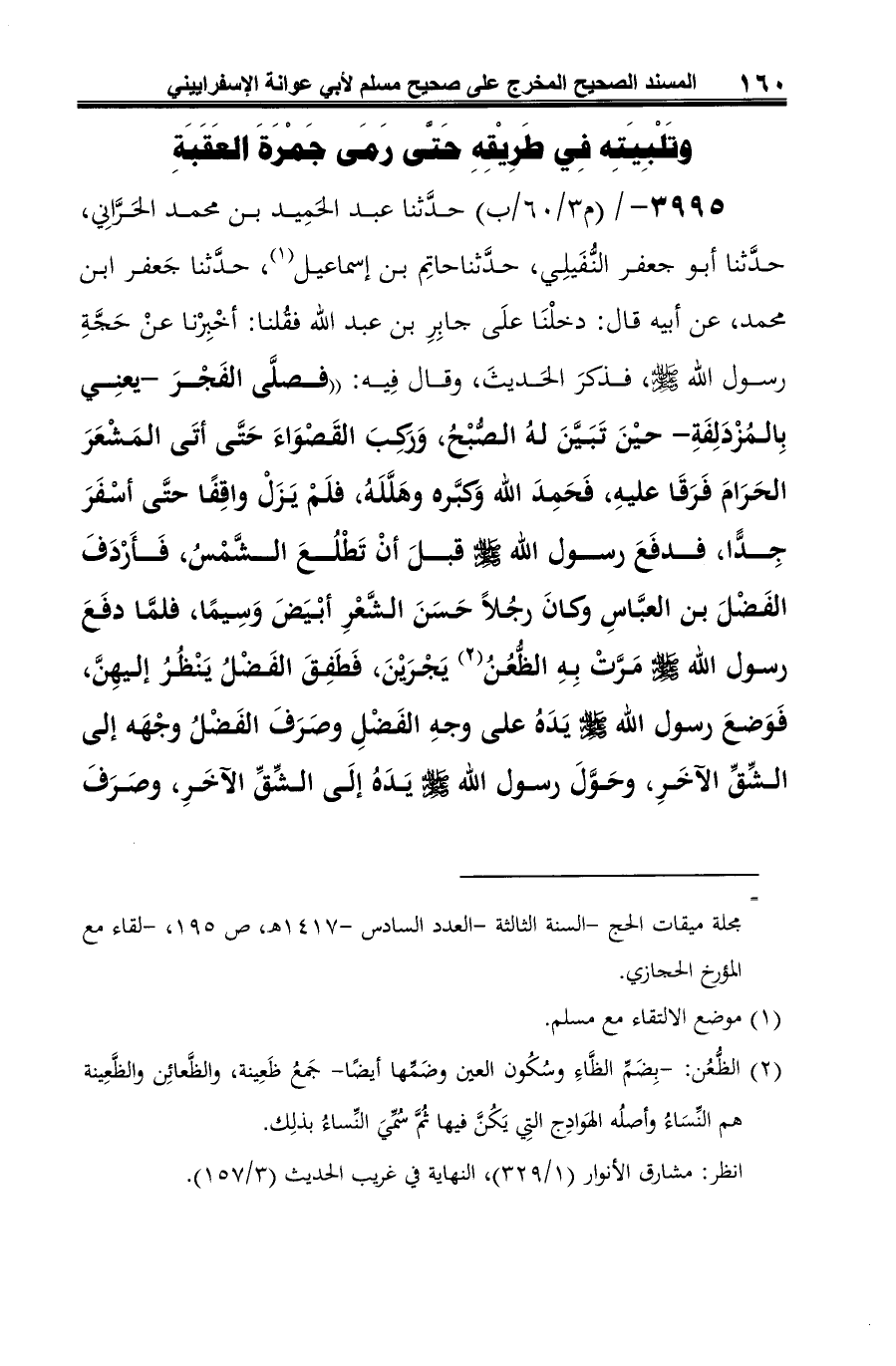 3995 - حدَّثنا عبد الحَمِيد بن محمد الحَرَّانِي، حدَّثنا أبو جعفر النُّفَيلِي، حدَّثنا حاتِم بن إسماعيل (¬1)، حدَّثنا جَعفر ابن محمد، عن أبيه قال: دخلْنَا علَى جابِرِ بن عبد الله فقُلنا: أخبرْنا عنْ حَجَّةِ رسول الله -صلى الله عليه وسلم-، فذكرَ الحَديثَ، وقال فِيه: "فصلَّى الفَجْرَ -يعنِي بِالمُزْدَلِفَةِ- حيْنَ تَبَيَّنَ لهُ الصُّبْحُ، وَرَكِبَ القَصْوَاءَ حَتَّى أتَى المَشْعَرَ الحَرَامَ فَرَقَا عليهِ، فَحَمِدَ الله وَكبَّره وهَلَّلَهُ، فلَمْ يَزَلْ واقِفًا حتَّى أسْفَرَ جِدًّا، فدفَعَ رسول الله -صلى الله عليه وسلم- قبلَ أنْ تَطْلُعَ الشَّمْسُ، فَأَرْدَفَ الفَضْلَ بن العبَّاسِ وكانَ رجُلًا حَسَنَ الشَّعْرِ أبْيَضَ وَسيمًا، فلمَّا دفَعَ رسول الله -صلى الله عليه وسلم- مَرَّتْ بِهِ الظُّعُنُ (¬2) يَجْرَيْنَ، فَطَفِقَ الفَضْلُ يَنْظُرُ إليهِنَّ، فَوَضعَ رسول الله -صلى الله عليه وسلم- يَدَهُ على وجهِ الفَضْلِ وصَرَفَ الفَضْلُ وجْهَه إلى الشِّقِّ الآخَرِ، وحَوَّلَ رسول الله -صلى الله عليه وسلم- يَدَهُ إلَى الشِّقِّ الآخَرِ، وصَرَفَ