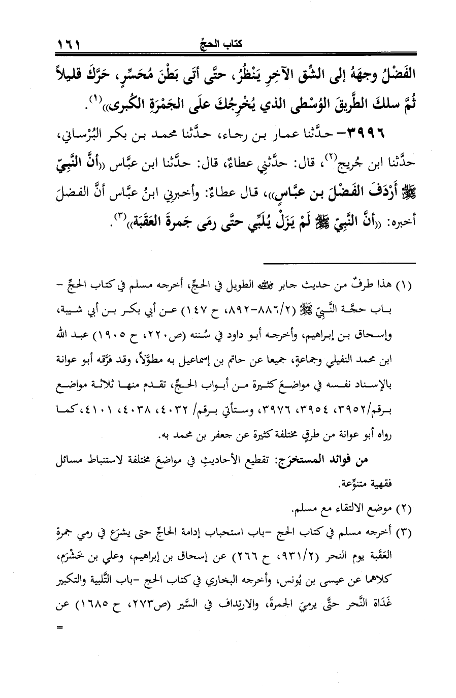 3996 - حدَّثنا عمار بن رجاء، حدَّثنا محمد بن بكر البُرْساني، حدَّثنا ابن جُريج (¬1)، قال: حدَّثنِي عطاءٌ، قال: حدَّثنا ابن عبَّاس "أنَّ النَّبِيّ -صلى الله عليه وسلم- أَرْدَفَ الفَضْلَ بن عبَّاسٍ"، قال عطاءٌ: وأخبرِني ابنُ عبَّاس أنَّ الفضلَ أخبره: "أنَّ النَّبِي -صلى الله عليه وسلم- لَمْ يَزَلْ يُلَبّي حتَّى رمَى جَمرةَ العَقَبَة" (¬2).