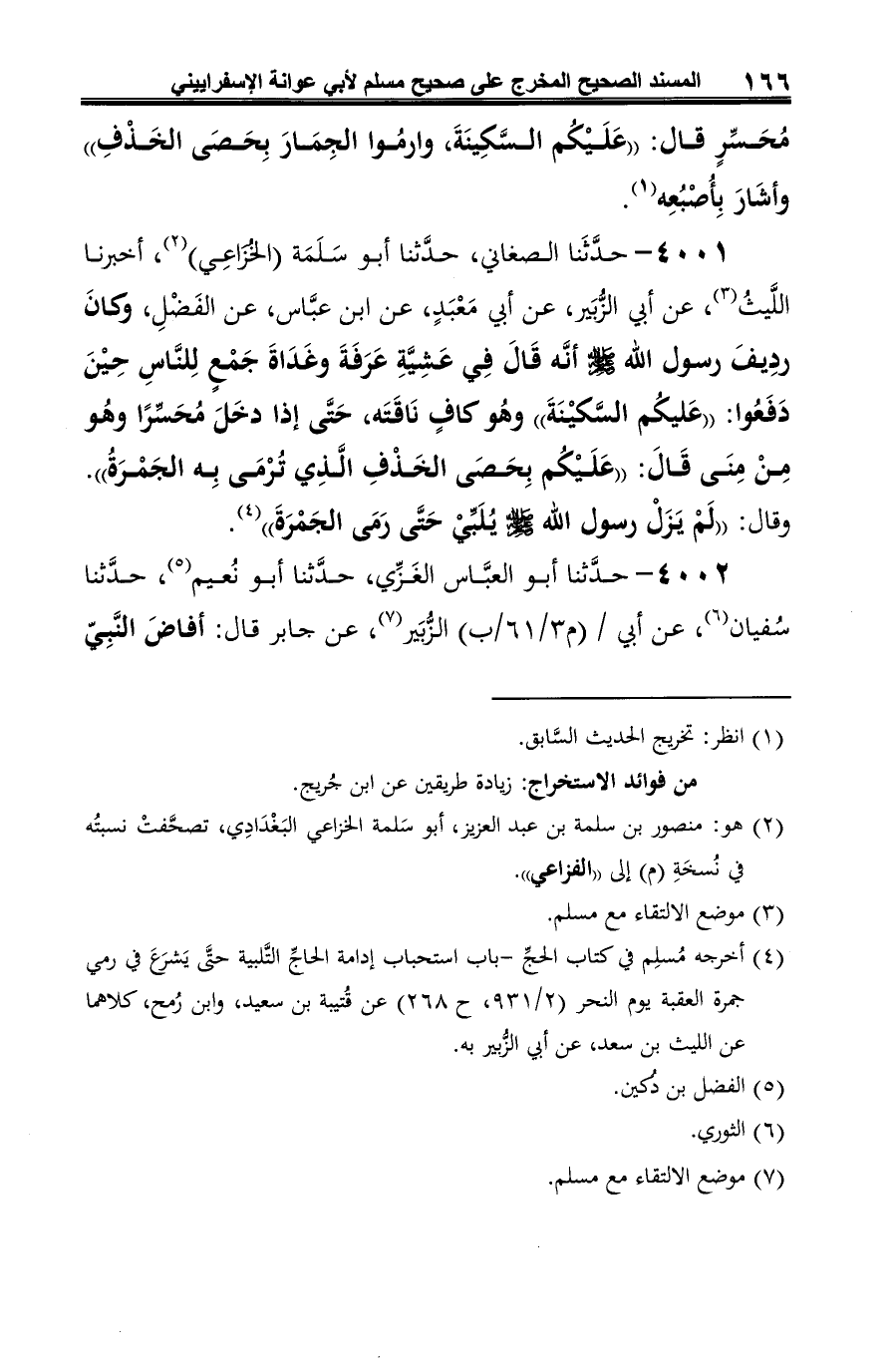 (¬4) أخرجه مسلم في كتاب الحجِّ -باب استحباب رمي جمرة العقبة يوم النّحر راكِبا، وبيان قوله -صلى الله عليه وسلم-: "لتأخذُوا عنِّي مناسِكَكُم" (2/ 943، ح 310) عن إسحاق ابن إبراهيم، وعليِّ بن خَشْرم، عن عيسى بن يونس، عن ابن جُريجٍ، عن أبي الزُّبير به، وليس في لفظِه قولُه: "وَأَوْضَعَ في وَادِي مُحَسِّرٍ، وأَمَرَهُم أنْ يَرْمُوا الجِمَارَ بِمِثْلِ حَصَى الخَذْفِ"، وأخرجه النَّسائي بالزِّيادة المذكُورة في السُّنن الصُّغرى (ص 467، ح 3021) عن محمد بن منصور، عن أبي نُعيم الفضل بن كين، وأخرجه ابن خُزَيمة (4/ 272) عن سَلْمِ بن جنادة، عن وكيع، وعن محمد بن سفيان بن أبي الزَّرْدِ الأُبُلِّي، عن أبي عامر، وعن محمد بن العلاء، عن قبيصة، أربعتُهم عن سُفيان الثوري به، وانظر الحديث التَّالي.