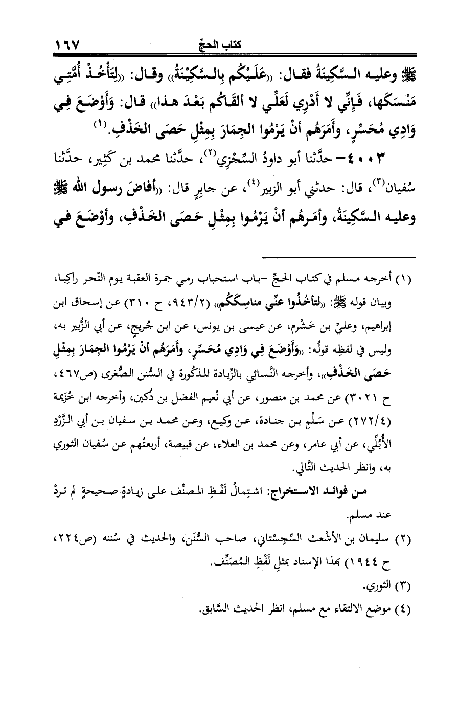4003 - حدَّثنا أبو داودُ السِّجْزِي (¬1)، حدَّثنا محمد بن كَثِير، حدَّثنا سُفيان (¬2)، قال: حدثني أبو الزبير (¬3)، عن جابِرٍ قال: "أفاض رسول الله -صلى الله عليه وسلم- وعليه السَّكِينَةُ، وأمَرهُم أنْ يَرْمُوا بِمِثْلِ حَصَى الخَذْفِ، وأوْضَعَ في
