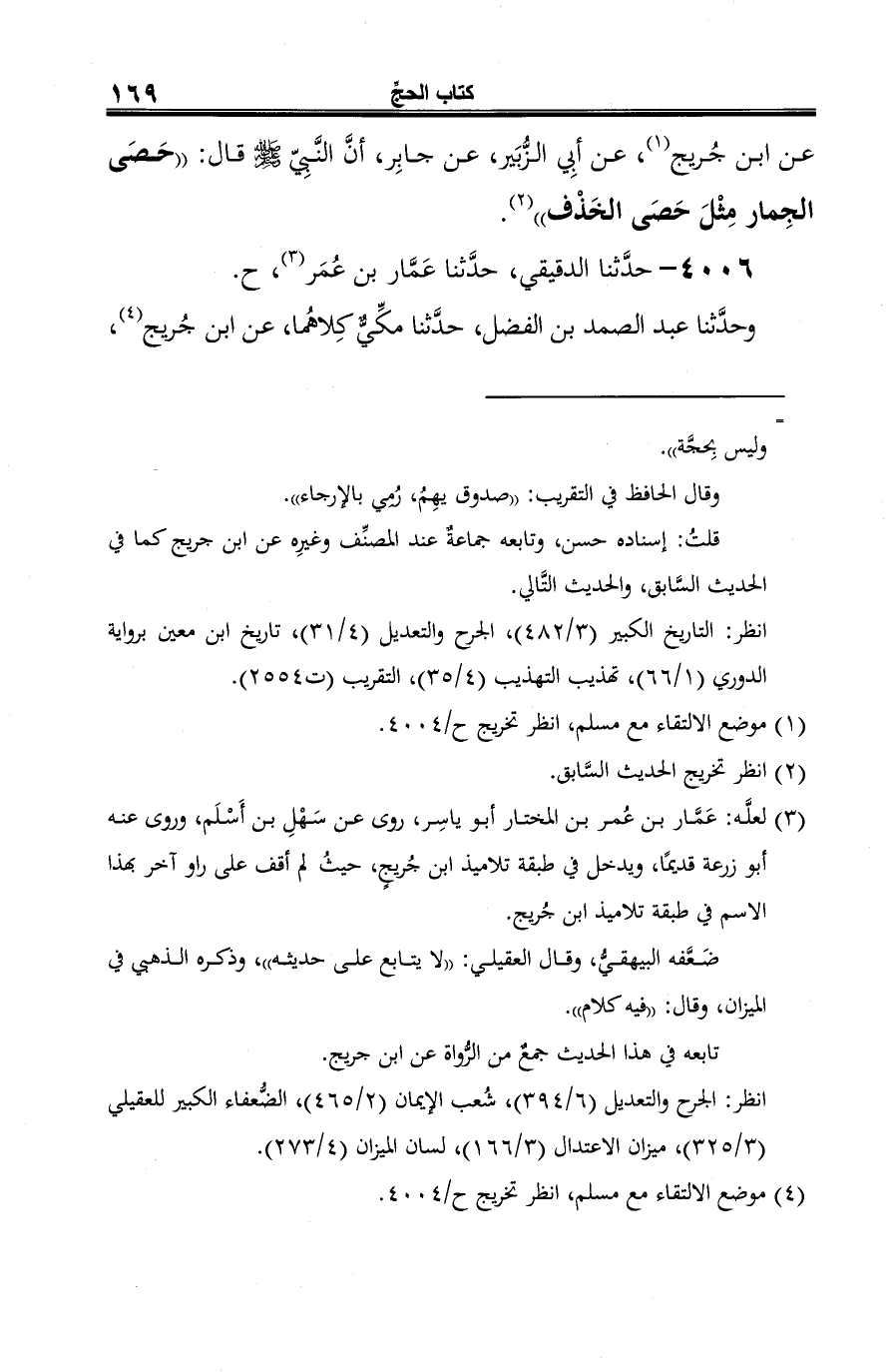 (¬1) لعلَّه: عَمَّار بن عُمر بن المختار أبو ياسِر، روى عن سَهْلِ بن أَسْلَم، وروى عنه أبو زرعة قديمًا، ويدخل في طبقة تلاميذ ابن جُريجٍ، حيثُ لم أقف على راو آخر بهذا الاسم في طبقة تلاميذ ابن جُريج.