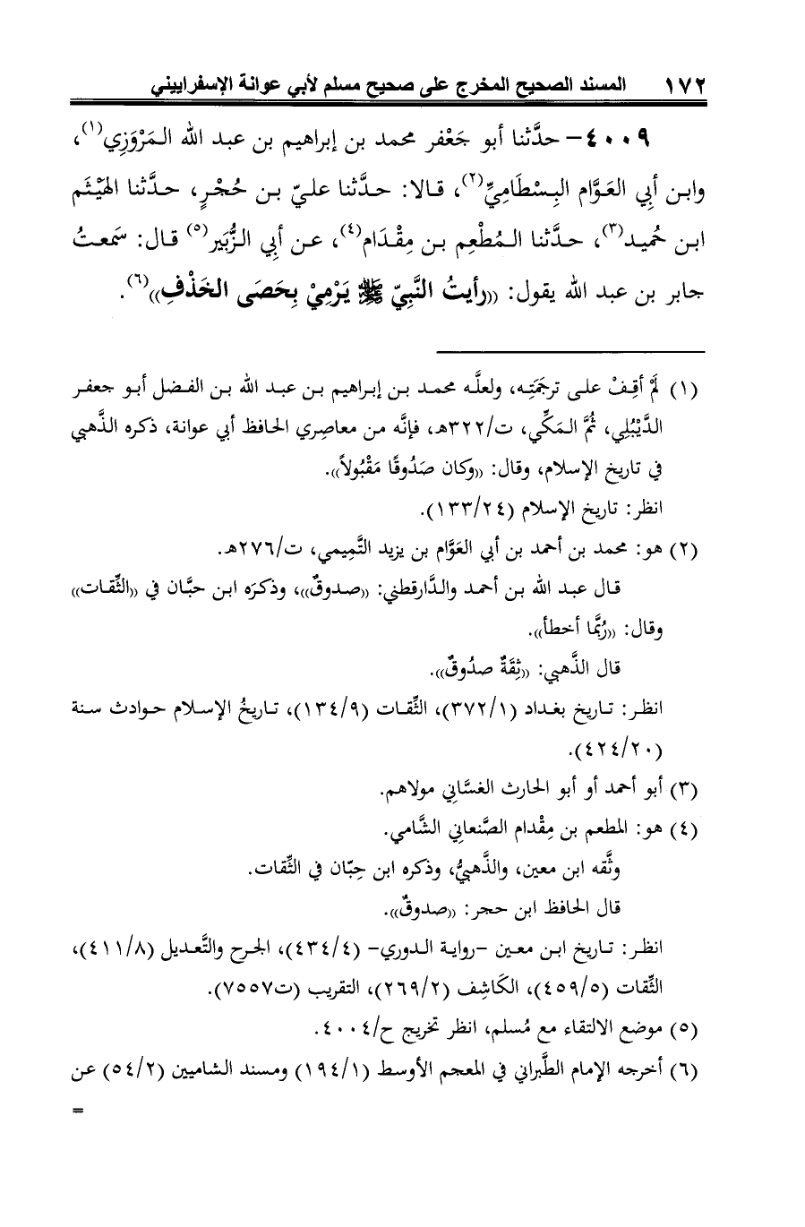 4009 - حدَّثنا أبو جَعْفر محمد بن إبراهيم بن عبد الله المَرْوَزِي (¬1)، وابن أبِي العَوَّام البِسْطَامِيِّ (¬2)، قالا: حدَّثنا عليّ بن حُجْرٍ، حدَّثنا الهيْثَم ابن حُميد (¬3)، حدَّثنا المُطْعِم بن مِقْدَام (¬4)، عن أبِي الزُّبَير (¬5) قال: سمَعتُ جابر بن عبد الله يقول: "رأيتُ النَّبِيّ -صلى الله عليه وسلم- يَرْمِيْ بِحَصَى الخَذْفِ" (¬6).