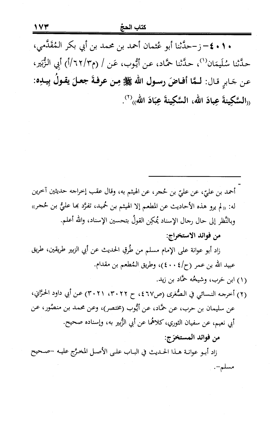 4010 - ز- حدَّثنا أبو عُثمان أحمد بن محمد بن أبي بكر المُقَدَّمي، حدَّثنا سُلَيمَان (¬1)، حدَّثنا حمَّاد، عن أيُّوب، عَن أبِي الزُّبَير، عن جَابرٍ قال: لمَّا أفاضَ رسول الله -صلى الله عليه وسلم- مِن عرفةَ جعلَ يقولُ بِيدِه: "السَّكِينةَ عِبادَ الله، السَّكِينةَ عِبَادَ الله" (¬2).