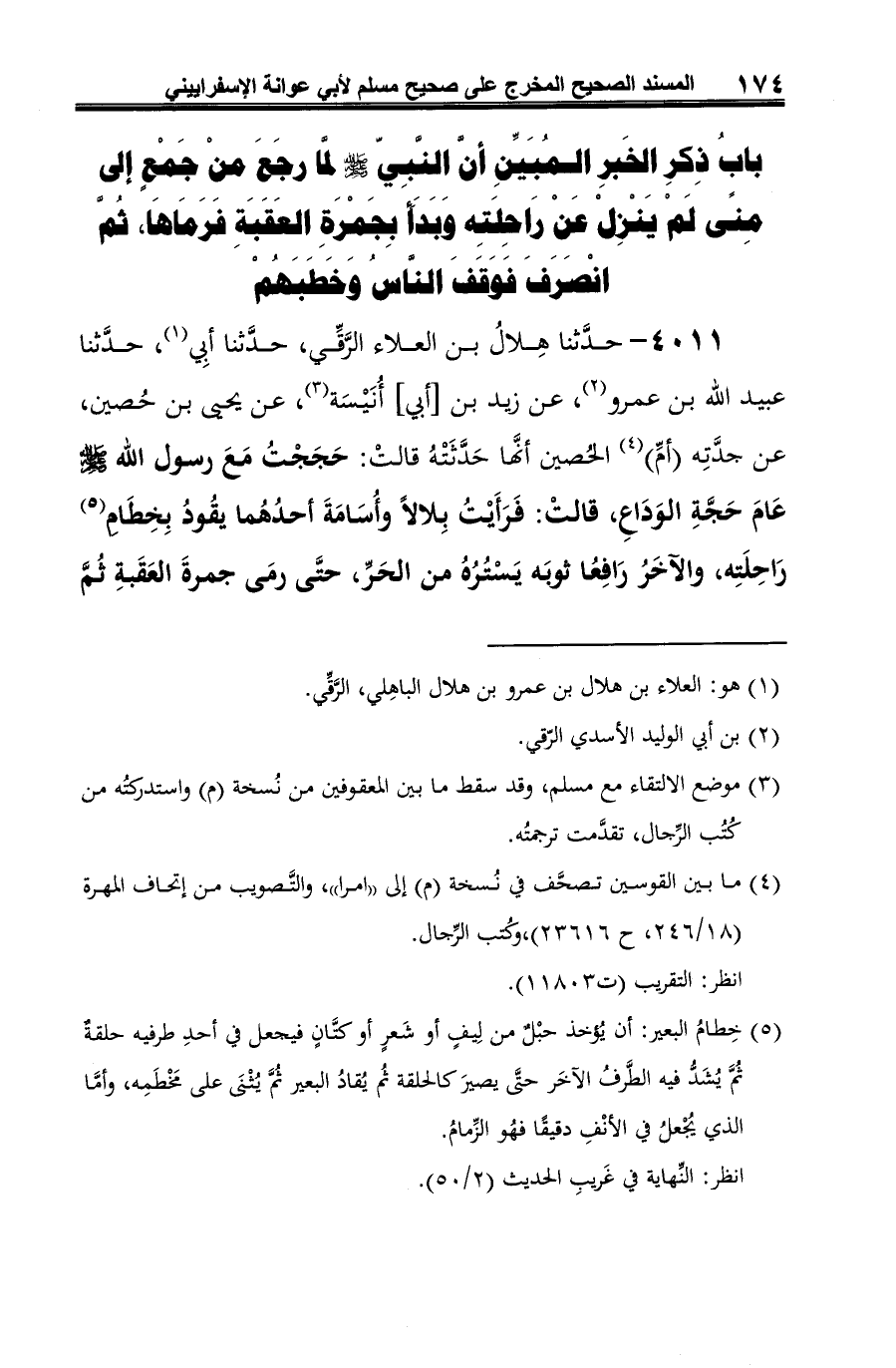 (¬8) إسناد أبي عوانة للحديث ضعيف، لحالة هلال بن العلاء، ولكنِّ الحديثَ صحيحٌ أخرجه مسلم في كتاب الحجِّ -باب استحباب رمي جمرة العقبة يوم النَّحر راكبًا ... (2/ 944، ح 311) عن سلَمة بن شَبِيب، عن الحَسَنِ بن أَعْيَنَ، عن مَعْقِل ابن عبيد الله، عن زَيدْ بن أنيسة به، وليس في لفظه قولُه: "وقدْ جَعَلَ ثَوْبَهُ تَحْتَ إِبْطِهِ عَلَى عَاتِقِه الأيْسرِ، فرَأيتُ تَحْتَ غُضْرُوفِ كَتِفِه الأَيمَنِ كَهَيْئَةِ جَمْعٍ وَذكرَ أصَابِعَهُ"، وأخرجه ابنُ خُريمة في صحيحه (4/ 202) عن محمد بن يحيى (بدون الزِّيادة المذكورة عند أبي عوانة)، وأخرجه الطبراني في المعجم الكبير (25/ 157) عن أحمد ابن إسحاق الخَشَّاب، كلاهما عن عبد الله بن جعْفَر، وأخرجه ابن حِبَّان في صحيحه عن أبي يعلى، عن عبد الجبار بن عاصِم، كلاهمُا عن عبيد الله بن عمرو الرَّقّي به، بِالزِّيادة المذكُورة في لفظَيْهما. =