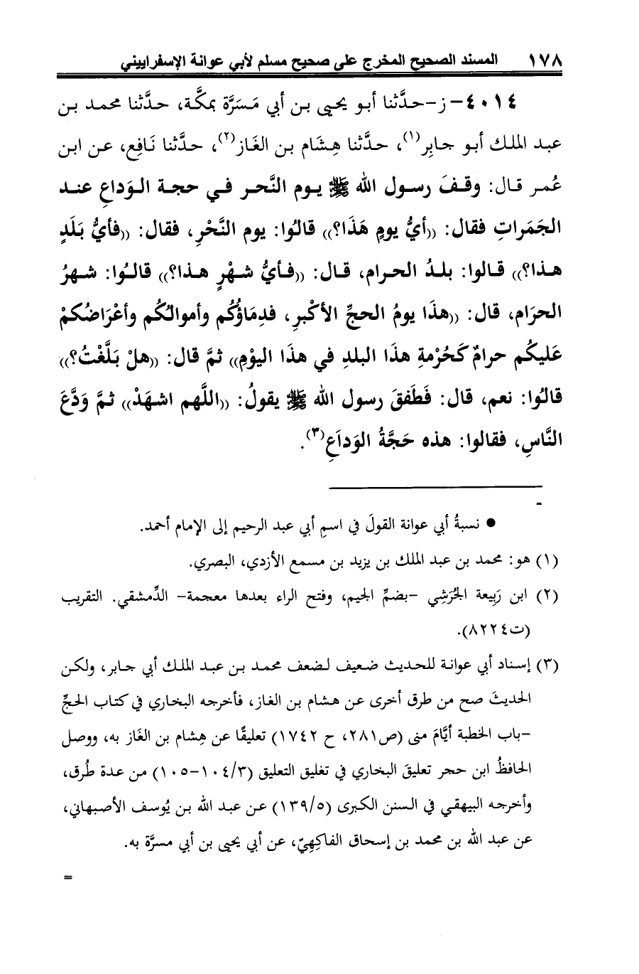 (¬3) إسناد أبي عوانة للحديث ضعيف لضعف محمد بن عبد الملك أبي جابر، ولكن الحديثَ صح من طرق أخرى عن هشام بن الغاز، فأخرجه البخاري في كتاب الحجِّ -باب الخطبة أيَّامَ منى (ص 281، ح 1742) تعليقًا عن هِشام بن الغَاز به، ووصل الحافظُ ابن حجر تعليقَ البخاري في تغليق التعليق (3/ 104 - 105) من عدة طُرق، وأخرجه البيهقي في السنن الكبرى (5/ 139) عن عبد الله بن يُوسف الأصبهاني، عن عبد الله بن محمد بن إسحاق الفاكِهِيّ، عن أبي يحيى بن أبي مسرَّة به. =