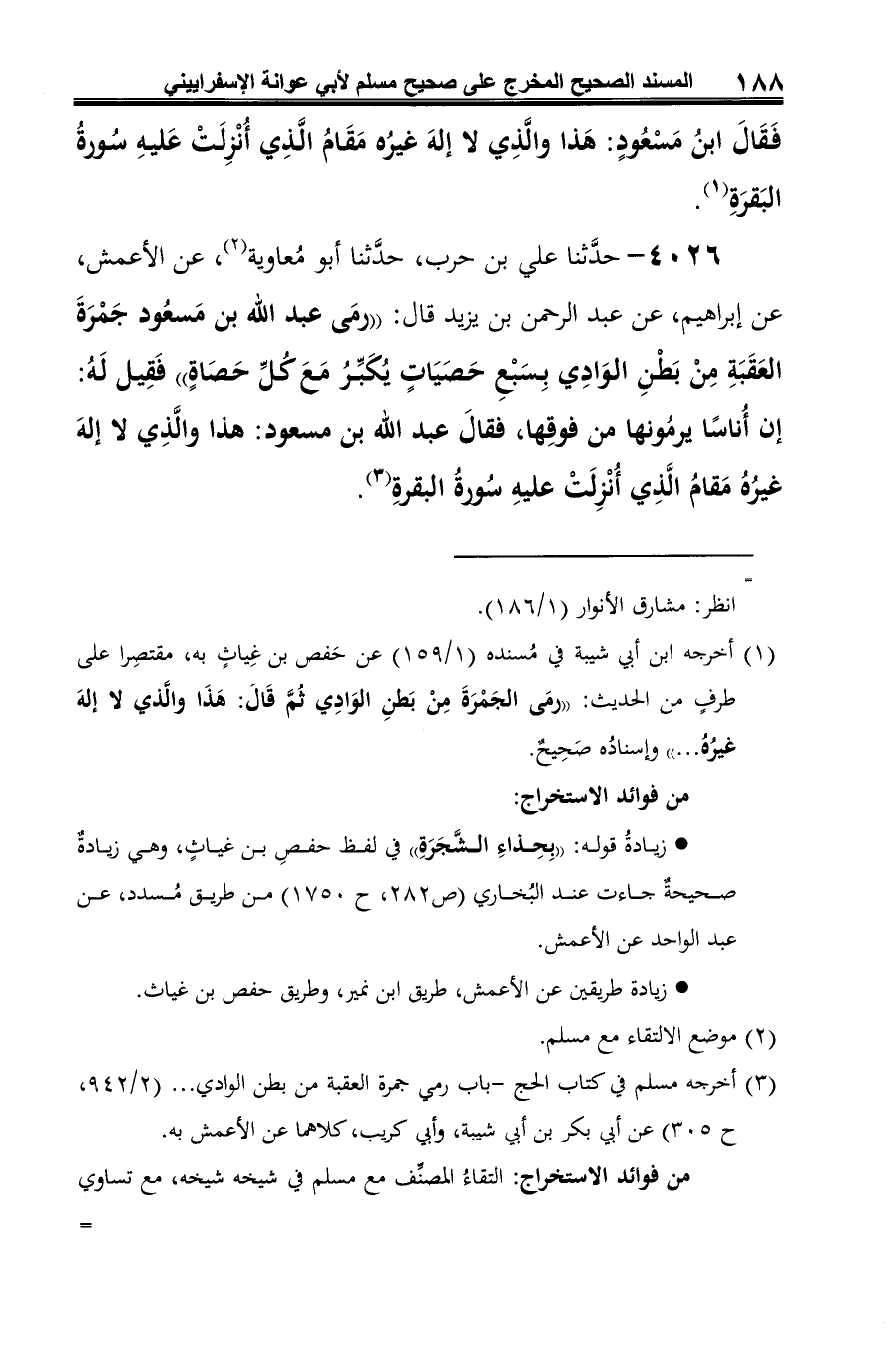 4026 - حدَّثنا علي بن حرب، حدَّثنا أبو مُعاوية (¬1)، عن الأعمش، عن إبراهيم، عن عبد الرحمن بن يزيد قال: "رمَى عبد الله بن مسعُود جَمْرَةَ العَقَبَةِ مِنْ بَطْنِ الوَادِي بِسَبْعِ حَصَيَاتٍ يُكَبِّرُ مَعَ كُلِّ حَصَاةٍ" فَقِيل لَهُ: إن أُناسًا يرمُونها من فوقِها، فقالَ عبد الله بن مسعود: هذا والَّذِي لا إلهَ غيرُهُ مَقامُ الَّذِي أُنْزِلَتْ عليهِ سُورةُ البقرةِ (¬2).