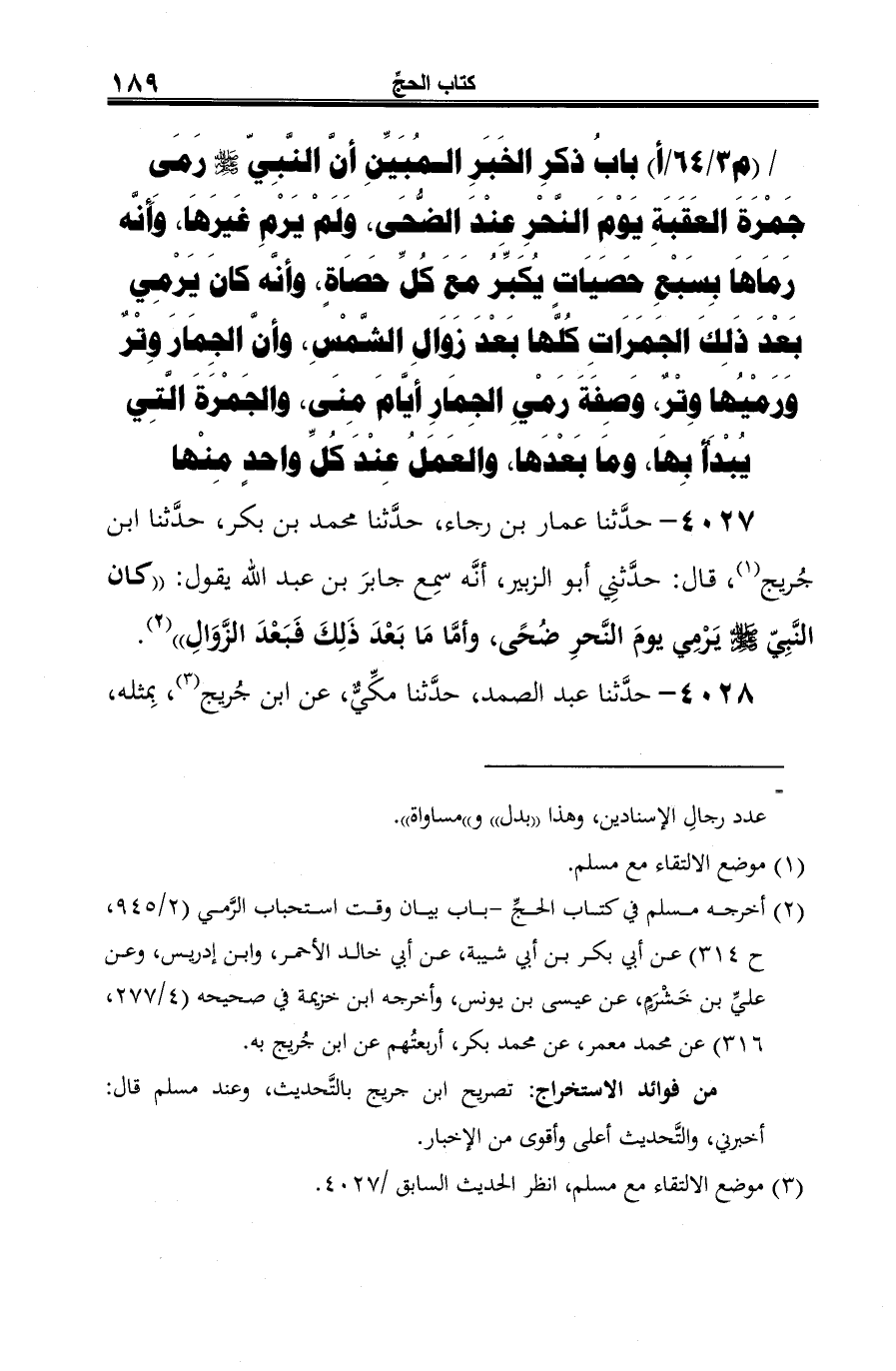 (¬2) أخرجه مسلم في كتاب الحجِّ -باب بيان وقت استحباب الرَّمي (2/ 945، ح 314) عن أبي بكر بن أبي شيبة، عن أبي خالد الأحمر، وابن إدريس، وعن عليِّ بن خَشْرَمٍ، عن عيسى بن يونس، وأخرجه ابن خزيمة في صحيحه (4/ 277، 316) عن محمد معمر، عن محمد بكر، أربعتُهم عن ابن جُريج به.