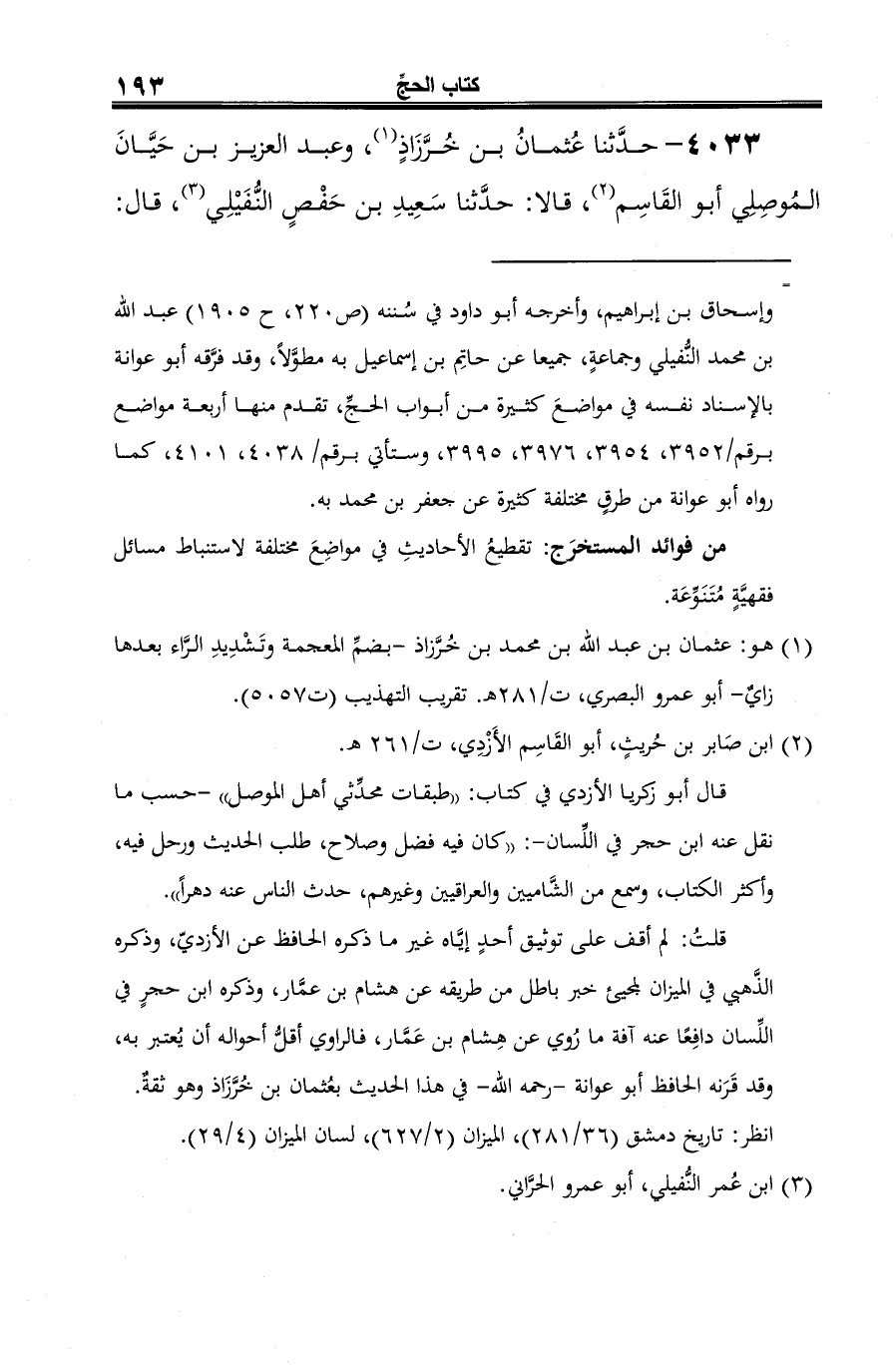 (¬1) هو: عثمان بن عبد الله بن محمد بن خُرَّزاذ -بضمِّ المعجمة وتَشْدِيدِ الرَّاء بعدها زايٌ- أبو عمرو البصري، ت / 281 هـ. تقريب التهذيب (ت 5057).