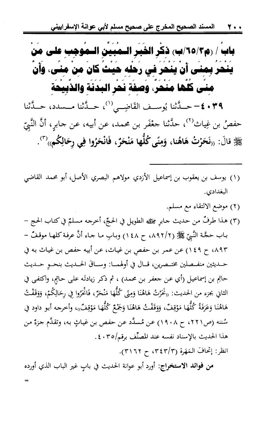 4039 - حدَّثنا يُوسف القَاضِي (¬1)، حدَّثنا مسدد، حدَّثنا حفصُ بن غِياث (¬2)، حدَّثنا جعْفَر بن محمد، عن أبيه، عن جابرٍ، أنَّ النَّبي -صلى الله عليه وسلم- قالَ: "نَحَرْتُ هَاهُنا، وَمِنًى كُلُّها مَنْحَرٌ، فَانْحَرُوا في رِحَالِكُم" (¬3).