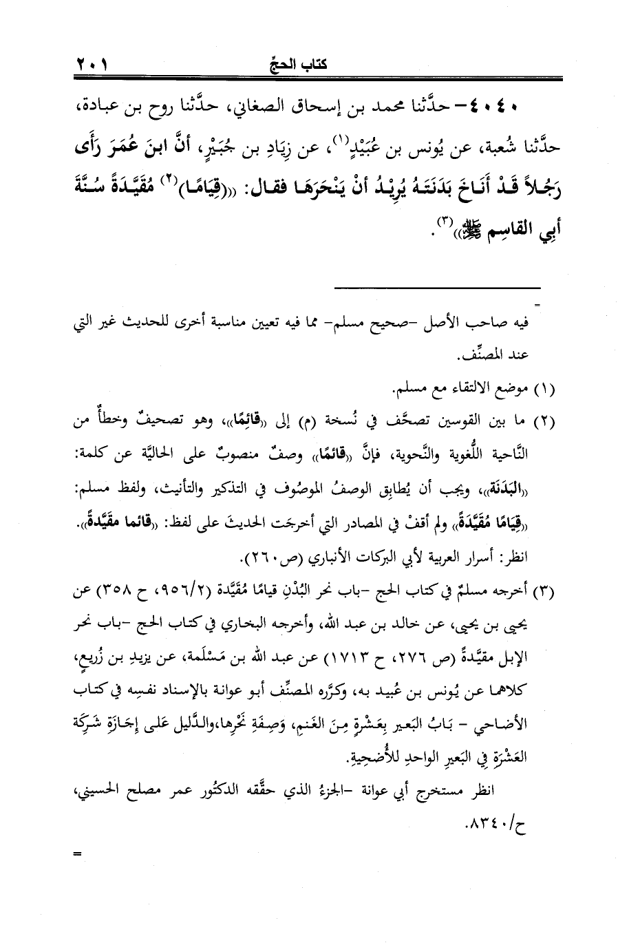 4040 - حدَّثنا محمد بن إسحاق الصغاني، حدَّثنا روح بن عبادة، حدَّثنا شُعبة، عن يُونس بن عُبَيْدٍ (¬1)، عن زِيَادِ بن جُبَيْرٍ، أنَّ ابنَ عُمَرَ رَأَى رَجُلًا قَدْ أَنَاخَ بَدَنَتَهُ يُرِيْدُ أنْ يَنْحَرَهَا فقال: " (قِيَامًا) (¬2) مُقَيَّدَةً سُنَّةَ أبِي القاسِم -صلى الله عليه وسلم-" (¬3).