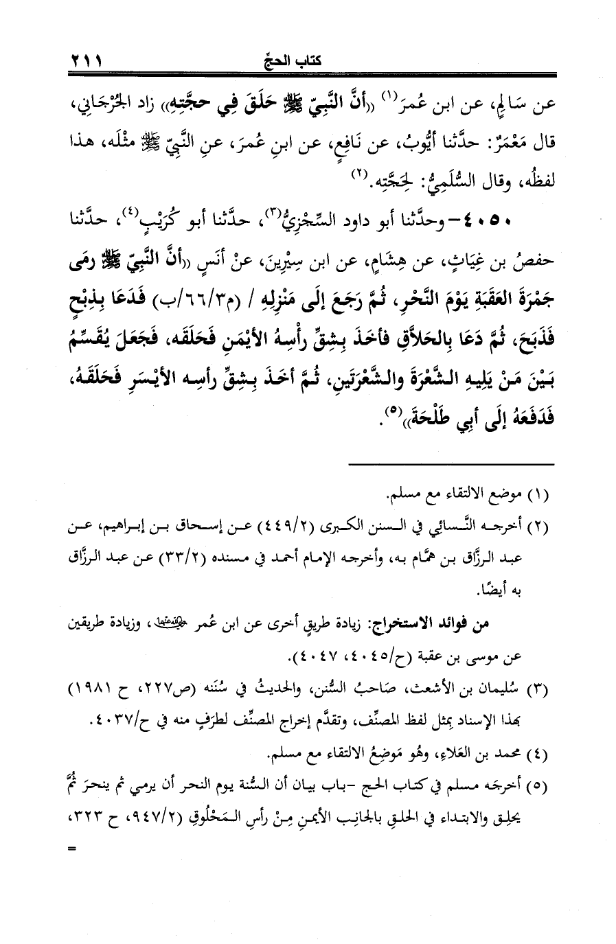 (¬3) أخرجَه مسلم في كتاب الحج -باب بيان أن السُّنة يوم النحر أن يرمي ثم ينحرَ ثُمَّ يحلِق والابتداء في الحلقِ بالجانِب الأيمنِ مِنْ رأسِ المَحْلُوقِ (2/ 947، ح 323، =