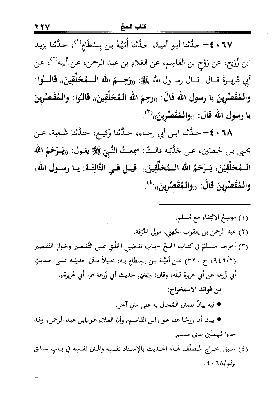 (¬3) أخرجه مسلمٌ في كتاب الحجِّ -باب تفضيلِ الحَلْقِ على التَّقصير وجَوازِ التَّقصير (2/ 946، ح 320) عن أميَّة بن بِسطام به، محيلًا متْنَ حديثِه على حديثِ أبي زُرعة عن أبي هريرة قبلَه، وقال: "بمعنى حديث أبي زُرعة عن أبي هُريرة".