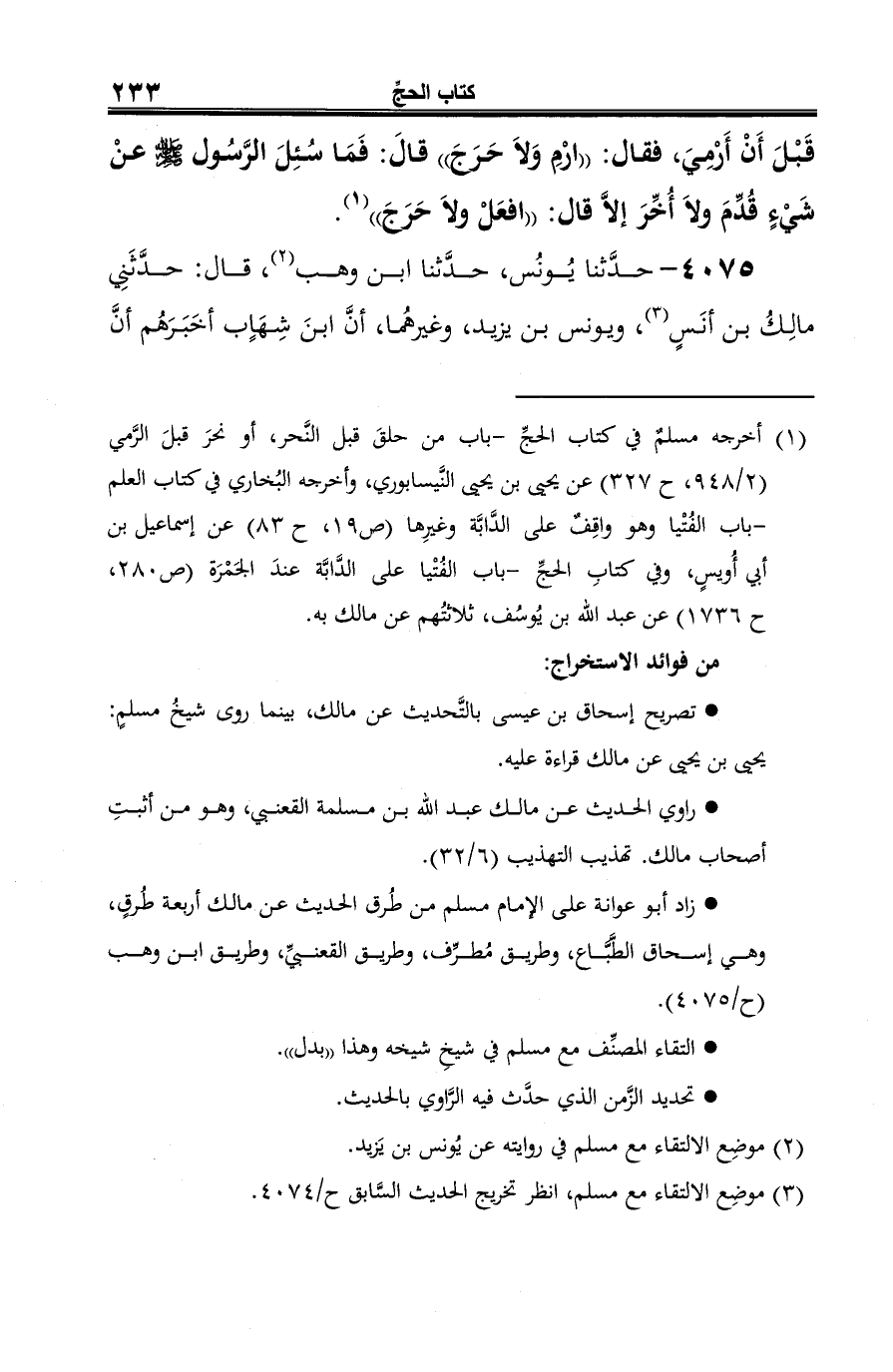 (¬3) أخرجه مسلمٌ في كتاب الحجِّ -باب من حلقَ قبل النَّحر، أو نحرَ قبلَ الرَّمي (2/ 948، ح 328) عن حَرْملةَ بن يحيى، عن ابن وهبٍ، عن يوُنُس به وحدَهُ، وفي لفظِه: "قَالَ فَمَا سمَعْتُهُ يُسْألُ يَوْمَئِذٍ عَنْ أَمْرٍ مِمَّا يَنْسَى المَرْءُ وَيَجْهَلُ مِنْ تَقْديمِ بَعْضِ الأُمُورِ قَبْلَ بَعْضٍ، وَأَشْبَاهِهَا إِلَّا قَالَ رسول الله -صلى الله عليه وسلم- افْعَلُوا ذَلِكَ وَلاَ حَرَجَ"، وأخرجه الطَّحاويُّ في شرح معاني الآثار (2/ 237) عن يونس بن عبد الأعلى به، كما أخرجه أبو نعيم في مستخرجه (3/ 384) عن محمد بن إبراهيم عن محمد بن الحسن عن حرملة بن يحيى عن ابن وهب، عن يونس، عن ابن شِهاب الزُّهريِّ به.