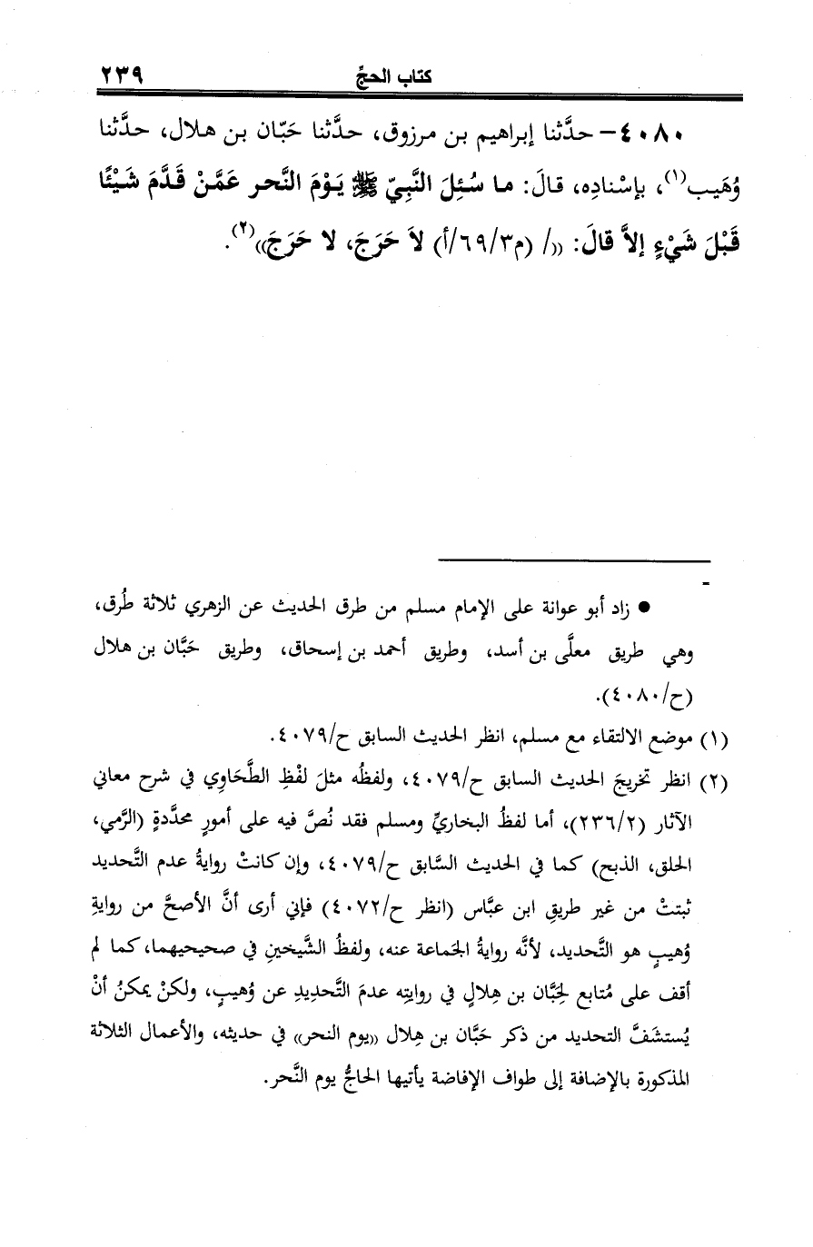 (¬2) انظر تخريجَ الحديث السابق ح / 4079، ولفظُه مثلَ لفْظِ الطَّحَاوِي في شرح معاني الآثار (2/ 236)، أما لفظُ البخاريّ ومسلم فقد نُصَّ فيه على أمورٍ محدَّدةٍ (الرَّمي، الحلق، الذبح) كما في الحديث السَّابق ح / 4079، وإن كانتْ روايةُ عدم التَّحديد ثبتتْ من غير طريقِ ابن عبَّاس (انظر ح / 4072) فإني أرى أنَّ الأصحَّ من روايةِ وُهيبٍ هو التَّحديد، لأنَّه روايةُ الجَماعة عنه، ولفظُ الشَّيخينِ في صحيحيهما، كما لم أقف على مُتابع لِحَبَّان بن هِلالٍ في روايتِه عدمَ التَّحدِيدِ عن وُهيبٍ، ولكنْ يمكنُ أنْ يُستشَفَّ التحديد من ذكر حَبَّان بن هِلال "يوم النحر" في حديثه، والأعمال الثلاثة المذكورة بالإضافة إلى طواف الإفاضة يأتيها الحاجُّ يوم النَّحر.