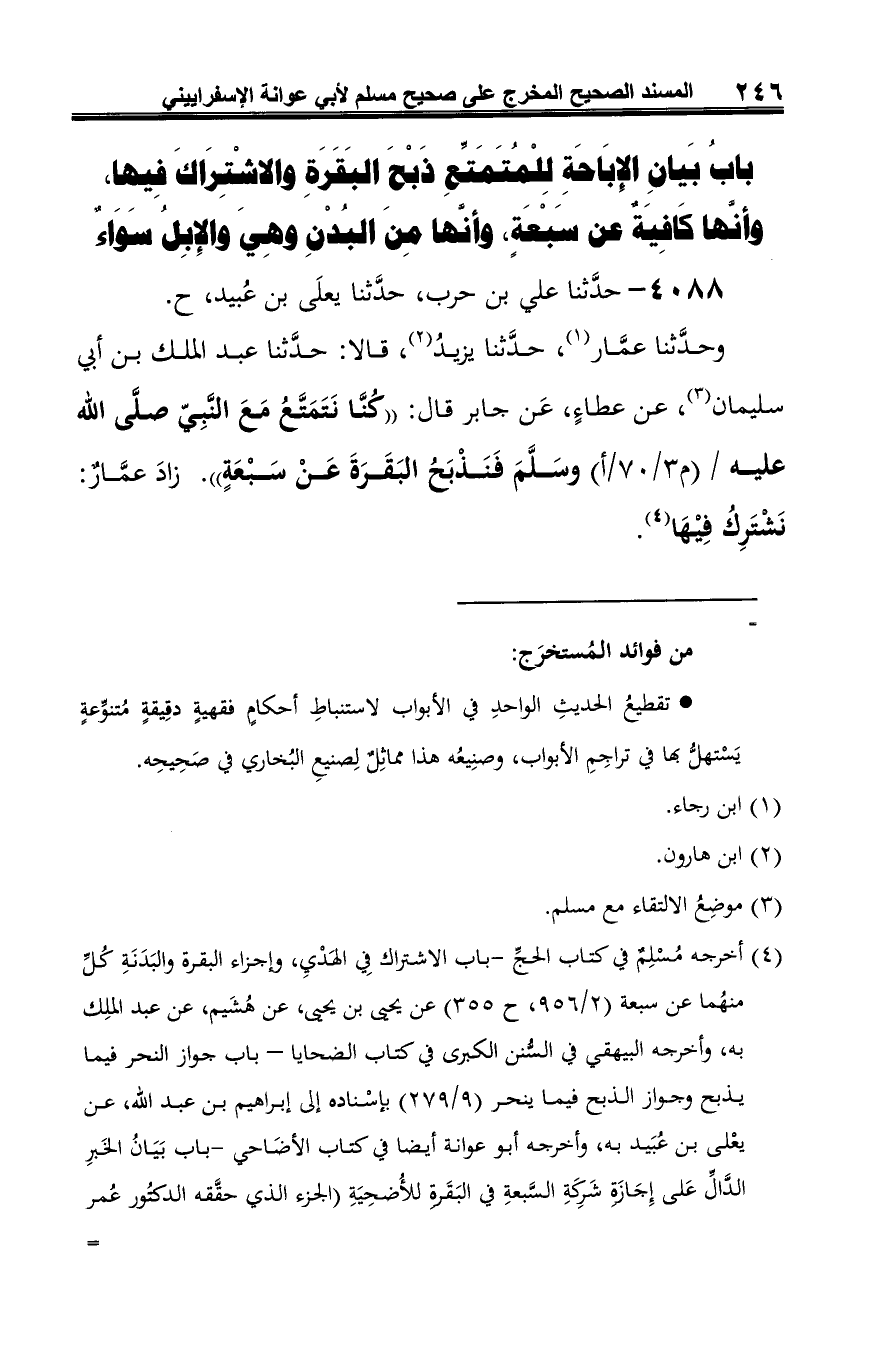 (¬4) أخرجه مُسْلِم في كتاب الحجِّ -باب الاشتراك في الهَدْيِ، وإجزاء البقرة والبَدَنَةِ كُلِّ منهُما عن سبعة (2/ 956، ح 355) عن يحيى بن يحيى، عن هُشَيم، عن عبد الملِك به، وأخرجه البيهقي في السُّنن الكبرى في كتاب الضحايا -باب جواز النحر فيما يذبح وجواز الذبح فيما ينحر (9/ 279) بإسْناده إلى إبراهيم بن عبد الله، عن يعْلى بن عُبَيد به، وأخرجه أبو عوانة أيضا في كتاب الأضَاحي -باب بَيَانُ الخَبرِ الدَّالَّ عَلى إِجَازة شَركِةِ السَّبعةِ في البَقَرة للأُضحِيَةِ (الجزء الذي حقَّقه الدكتُور عُمر =