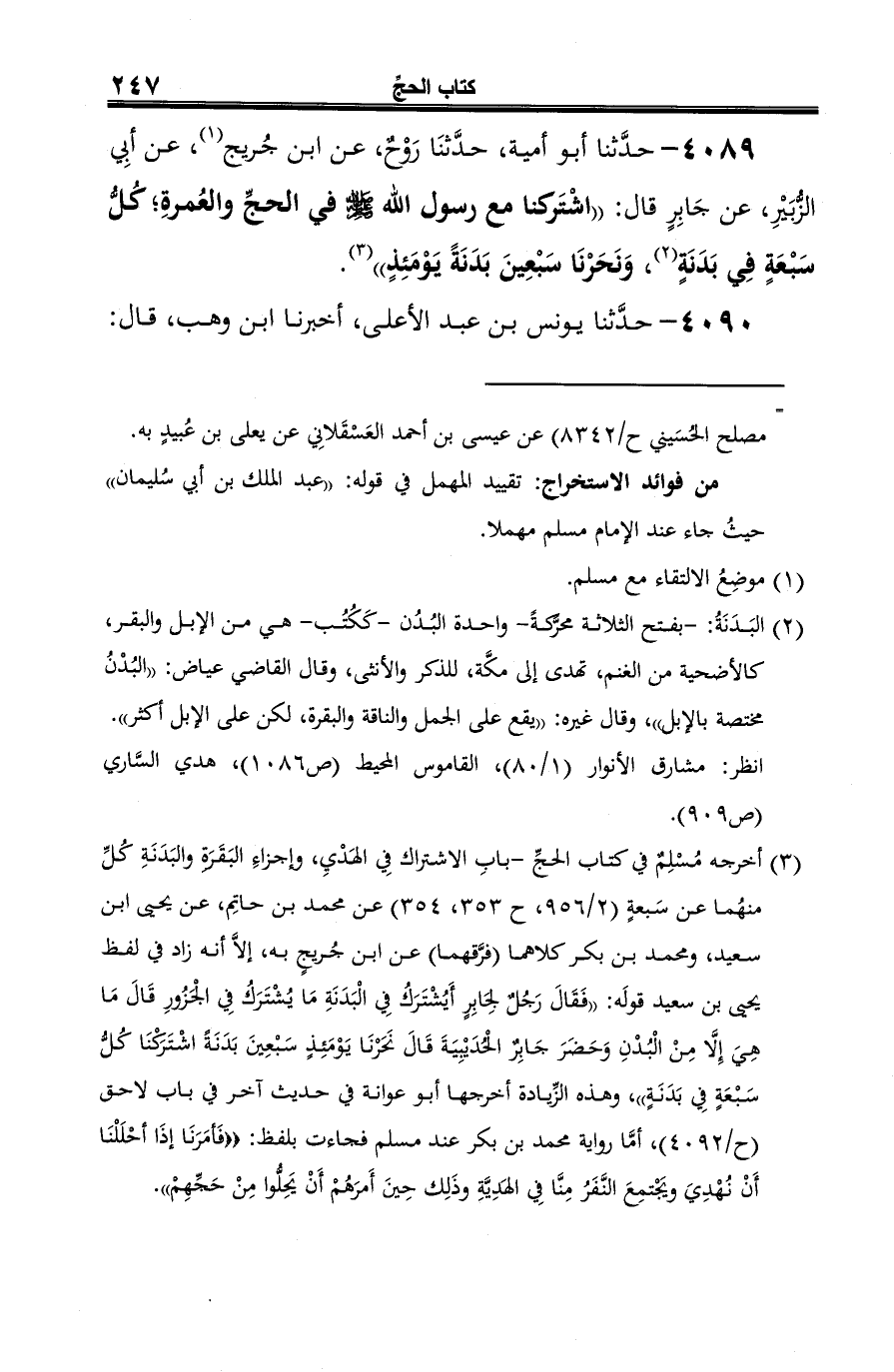 4089 - حدَّثنا أبو أمية، حدَّثنَا رَوْحٌ، عن ابن جُريج (¬1)، عن أبِي الزُّبَيْرِ، عن جَابِرٍ قال: "اشْتَركنا مع رسول الله -صلى الله عليه وسلم- في الحجِّ والعُمرةِ؛ كُلُّ سَبْعَةٍ في بَدَنَةٍ (¬2)، وَنَحَرْنَا سَبْعِينَ بَدَنَةً يَوْمَئِذٍ" (¬3).