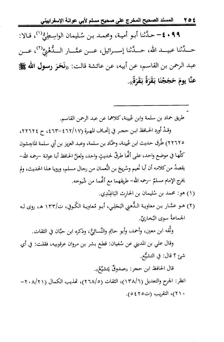 (¬3) أخرجه النَّسائي في السُّنن الكبرى (2/ 458) عن أحمد بن سليمان، عن عبيد الله بن مُوسى، عن إسرائيل، عن عمَّار الدُّهني به، وقد تفرَّد عمَّار بهذا اللَّفظ، وخالفه جمعٌ من الثِّقات فيه، ولهذا قال أبو عوانة: "لعمَّارٍ غريبٌ .. "، قال الحافظ ابن حجر في الفتح (3/ 644): "وأمَّا ما رواه عمَّارُ الدُّهني، عن عبد الرحمن بن القاسم عن أبيه عن عائشة قالت: "ذبح عنَّا رسول الله -صلى الله عليه وسلم- يوم حَجَحْنَا بقرةً بقرةً" أخرجه النسائي (2/ 389) أيضا فهو شاذٌّ مخالفٌ لما تقدَّم"، وسبقَ أن تكَلَّمتُ على طُرقِ الحديث وألفاظِه بالتفصيل في تخريج ح / 3741، فارجع إليه.