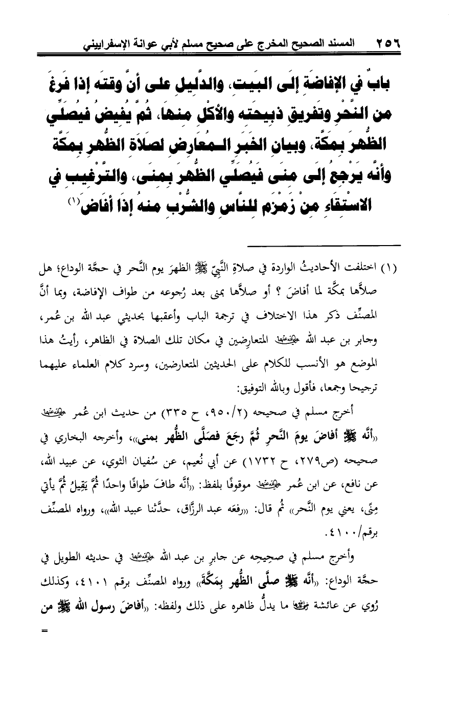 وأخرج مسلم في صحِيحِه عن جابرِ بن عبد الله -رضي الله عنها- في حديثه الطويل في حجَّة الوداع: "أنَّه -صلى الله عليه وسلم- صلَّى الظُّهر بِمَكَّةَ" ورواه المصنِّف برقم 4101، وكذلك رُوي عن عائشة -رضي الله عنه- ما يدلُّ ظاهره على ذلك ولفظه: "أفاض رسول الله -صلى الله عليه وسلم- من =