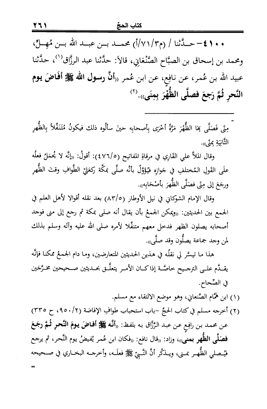 4100 - حدَّثنا محمد بن عبد الله بن مُهلٍّ، ومحمد بن إسحاق بن الصبَّاح الصَّنْعَانِي، قالاَ: حدَّثنا عبد الرزَّاق (¬1)، حدَّثنا عبيد الله بن عُمر، عن نافِعٍ، عن ابن عُمر "أنَّ رسول الله -صلى الله عليه وسلم- أفاض يوم النَّحر ثُمَّ رَجعَ فصلَّى الظُّهْرَ بِمِنَى". (¬2)