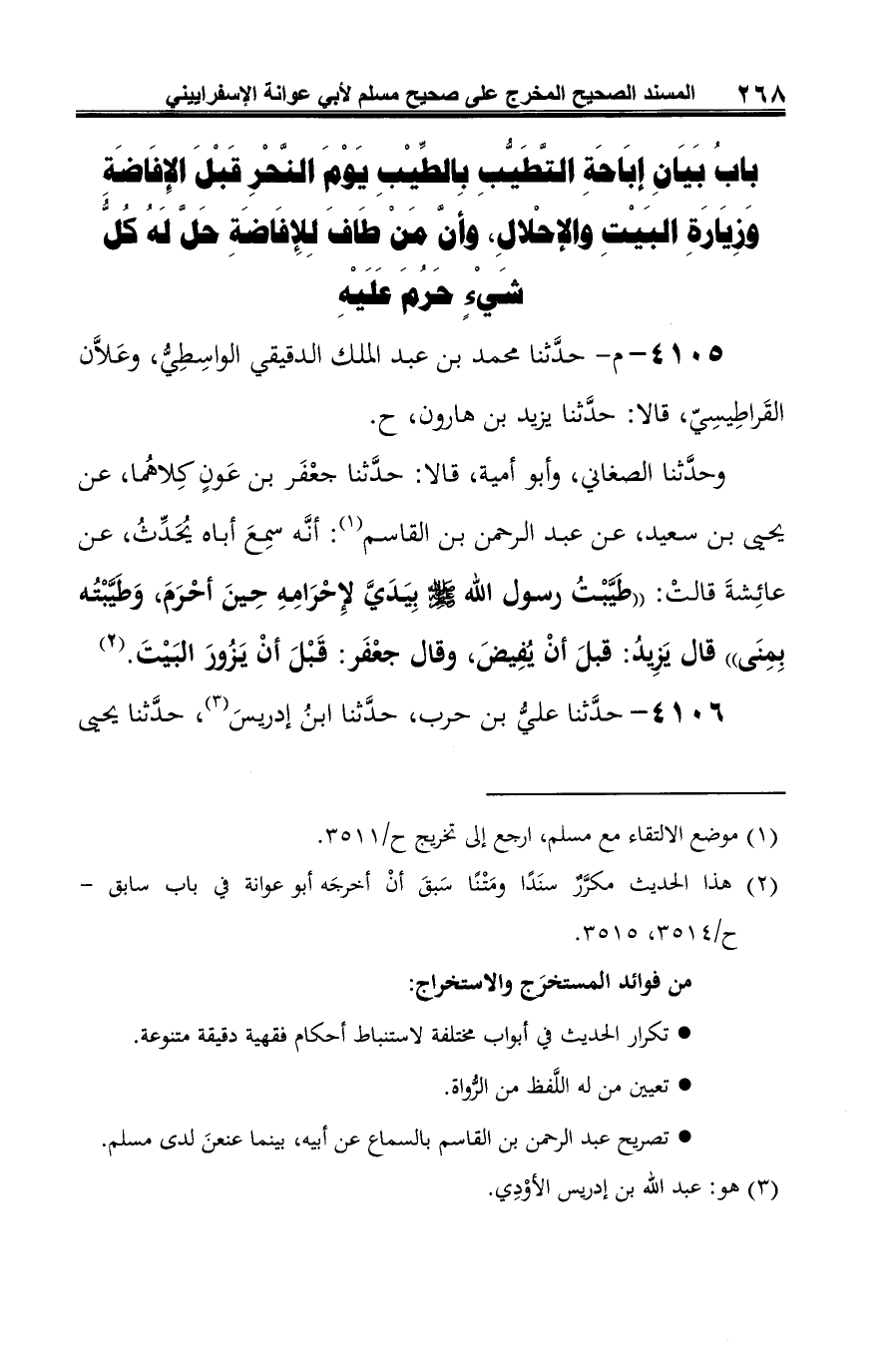 (¬3) أخرجه النَّسائيُّ السُّنن الصغرى (ص 420، ح 2691) والكبرى (2/ 338) عن أحمد بن حرب الطائي، عن عبد الله بن إدريس به، ولكن قال: "حين يريدُ أن يَزُورَ البيتَ" بدلَ قوله: "قبل أن يطُوفَ بِالبَيتِ" ومعنى اللَّفظين واحد، وسبقَ أن أخرجَه أبو عوانة من طُرقٍ أخرى عن يحيى بن سعيد في باب سابق: (ح / 3514، 3515).