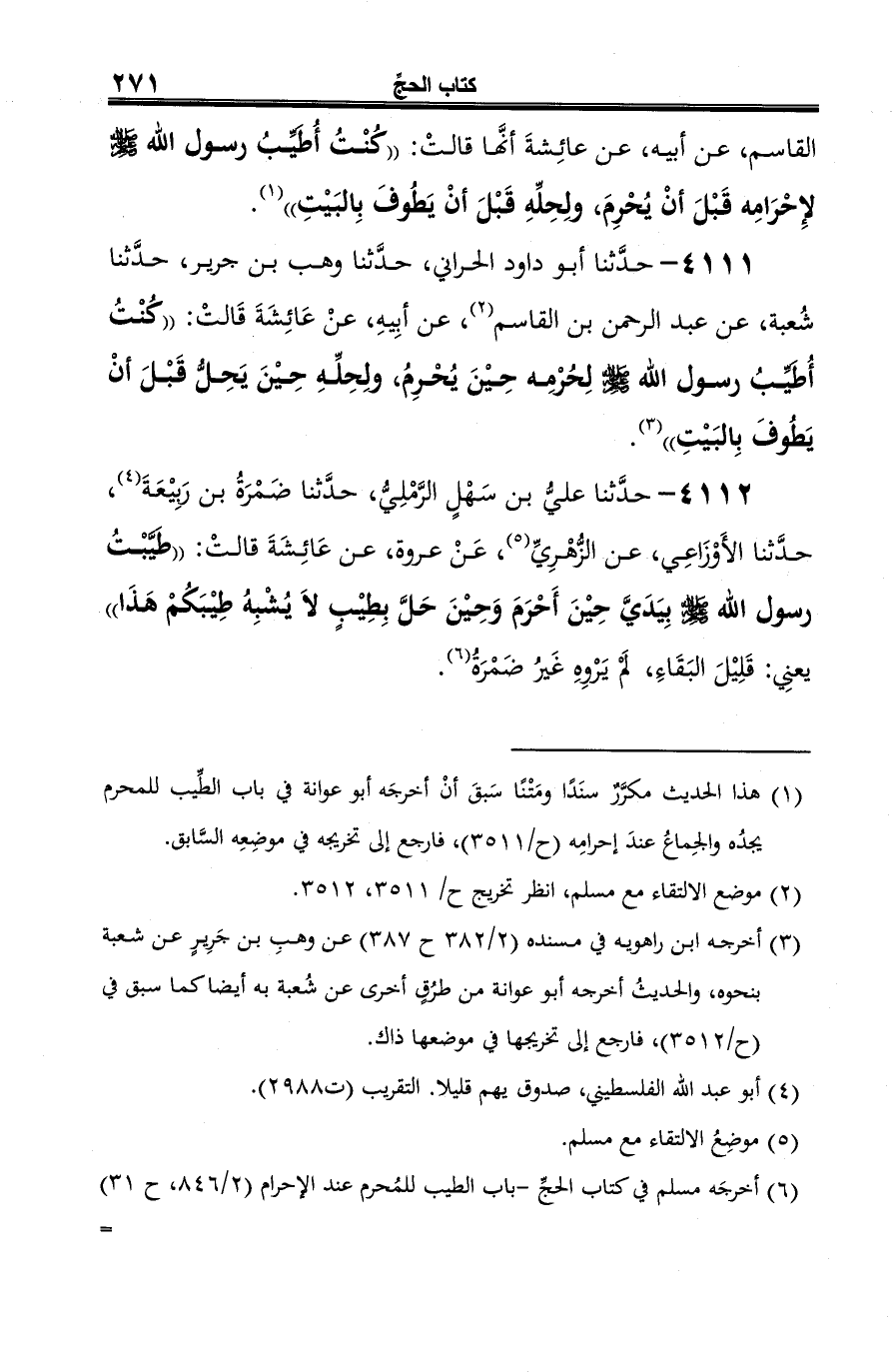 4111 - حدَّثنا أبو داود الحراني، حدَّثنا وهب بن جرير، حدَّثنا شُعبة، عن عبد الرحمن بن القاسم (¬1)، عن أبِيهِ، عنْ عَائِشَةَ قَالتْ: "كُنْتُ أُطيبُ رسول الله -صلى الله عليه وسلم- لِحُرْمِه حِيْنَ يُحْرِمُ، ولِحِلِّهِ حِيْنَ يَحِلُّ قَبْلَ أنْ يَطُوفَ بِالبَيْتِ" (¬2).