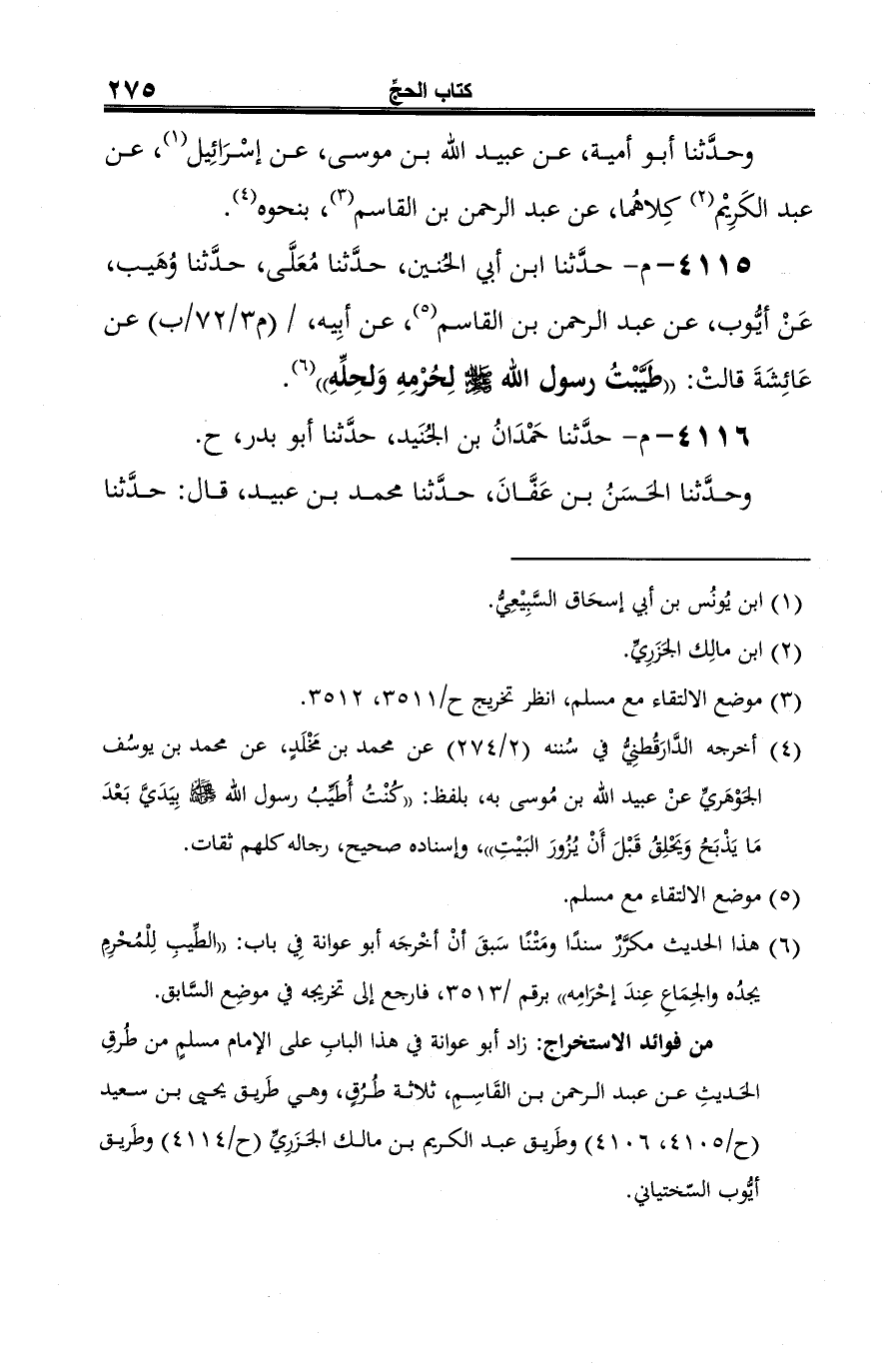 4115 - م- حدَّثنا ابن أبي الحُنين، حدَّثنا مُعَلَّى، حدَّثنا وُهَيب، عَنْ أيُّوب، عن عبد الرحمن بن القاسم (¬1)، عن أبِيه، عن عَائِشَةَ قالتْ: "طيَّبْتُ رسول الله -صلى الله عليه وسلم- لِحُرْمِهِ وَلحِلِّهِ" (¬2).