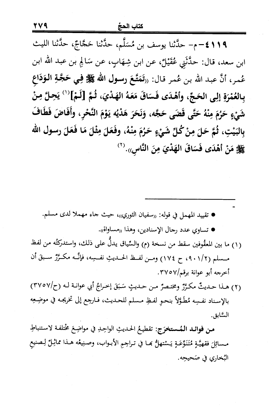 4119 - م- حدَّثنا يوسف بن مُسَلَّم، حدَّثنا حَجَّاجٌ، حدَّثنا الليث ابن سعد، قال: حدَّثَنِي عُقَيْلٌ، عن ابن شِهَابٍ، عن سَالِم بن عبد الله ابن عُمر، أنَّ عبد الله بن عُمر قال: "تَمَتَّعَ رسول الله -صلى الله عليه وسلم- في حَجَّةِ الوَدَاعِ بِالعُمْرَةِ إلِى الحَجِّ، وأهْدَى فَسَاقَ مَعَهُ الهَدْيَ، ثم [لم] (¬1) يَحِلَّ مِنْ شَيْءٍ حَرُمَ مِنْهُ حَتَّى قَضىَ حَجَّه، وَنَحَرَ هَدْيُه يَوْمَ النَّحْرِ، وأَفَاضَ فَطَافَ بِالبَيْتِ، ثُمَّ حَلَّ مِنْ كُلِّ شَيءٍ حَرُمَ مِنْهُ، وفَعَلَ مِثْلَ مَا فَعَلَ رسول الله -صلى الله عليه وسلم- مَنْ أهْدَى فَسَاقَ الهَدْيَ مِنَ الناسِ". (¬2)