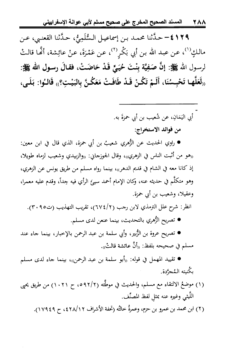 (¬3) أخرجهُ مسلمٌ في كتاب الحجِّ -باب وُجُوبِ طوافِ الوَداع وسُقوطِه عن الحَائِضِ (2/ 965، ح 385) عن يحيى بن يحيى النَّيسابوريِّ، وأخرجه البخاري في كتاب الحيض -باب المرأة تحيضُ بعد الإفاضةِ (ص 57، ح 328) عن عبد الله بن يوسُف، كِلاهما عن مالكٍ، عن عبد الله بن أبي بكر، عن أبيه عن عمرة به، ويُلاحظُ أنَّ أبا عوانةَ أسقَط من الإسناد محمدَ بن عمرو بن حزم (والد أبي بكر) ووافقه على ذلِك الطحاويُّ في شرح معاني الآثار (2/ 234) من طريق يونس بن عبد الأعلى عن ابن وهب عن مالك به، بينَما أثبته مالكٌ في موطَّئه (كما تقدَّم من طريق يحيى الليثي) وكذا البخاريُّ ومسلم في صحيحهما (كما في الإحالات السَّابقة وفي تحفة الأشراف 12/ 429، ح 17749) والنَّسائي في الكبرى (2/ 465) من طريق محمد بن سلمة، والحارث بن مسكين، كلاهما عن مالك، والإمامُ أحمد في مسنده (6/ 177) من طريق عبد الرحمن بن مهديٍّ عن مالك به.