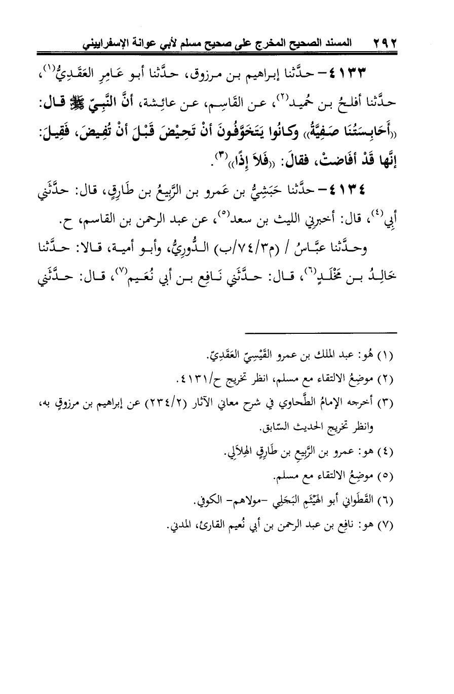 4134 - حدَّثنا حَبَشِيُّ بن عَمرو بن الرَّبِيعُ بن طَارِقٍ، قال: حدَّثَني أبِي (¬1)، قال: أخبرِني الليث بن سعد (¬2)، عن عبد الرحمن بن القاسم، ح.