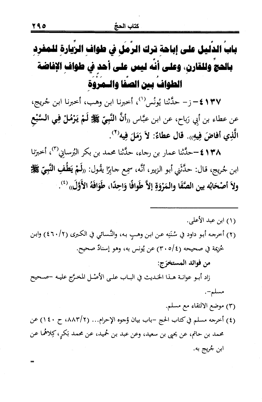 4137 - ز- حدَّثنا يُونُس (¬1)، أخبرنا ابن وهب، أخبرنا ابن جُريج، عن عطاء بن أبِي رَباح، عن ابن عبَّاس "أنَّ النَّبِيّ -صلى الله عليه وسلم- لَمْ يَرملْ في السَّبْعِ الَّذِي أفاضَ فِيهِ". قال عطاءٌ: لاَ رَمَلَ فِيه (¬2).
