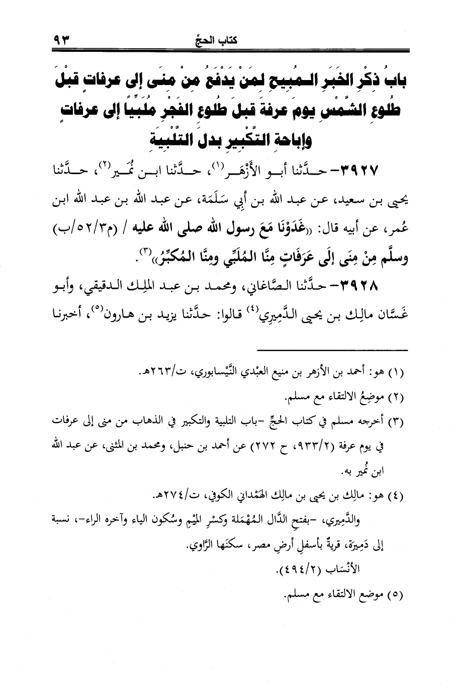 (¬3) أخرجه مسلم في كتاب الحجِّ -باب التلبية والتكبير في الذهاب من منى إلى عرفات في يوم عرفة (2/ 933، ح 272) عن أحمد بن حنبل، ومحمد بن المثنى، عن عبد الله ابن نُمير به.