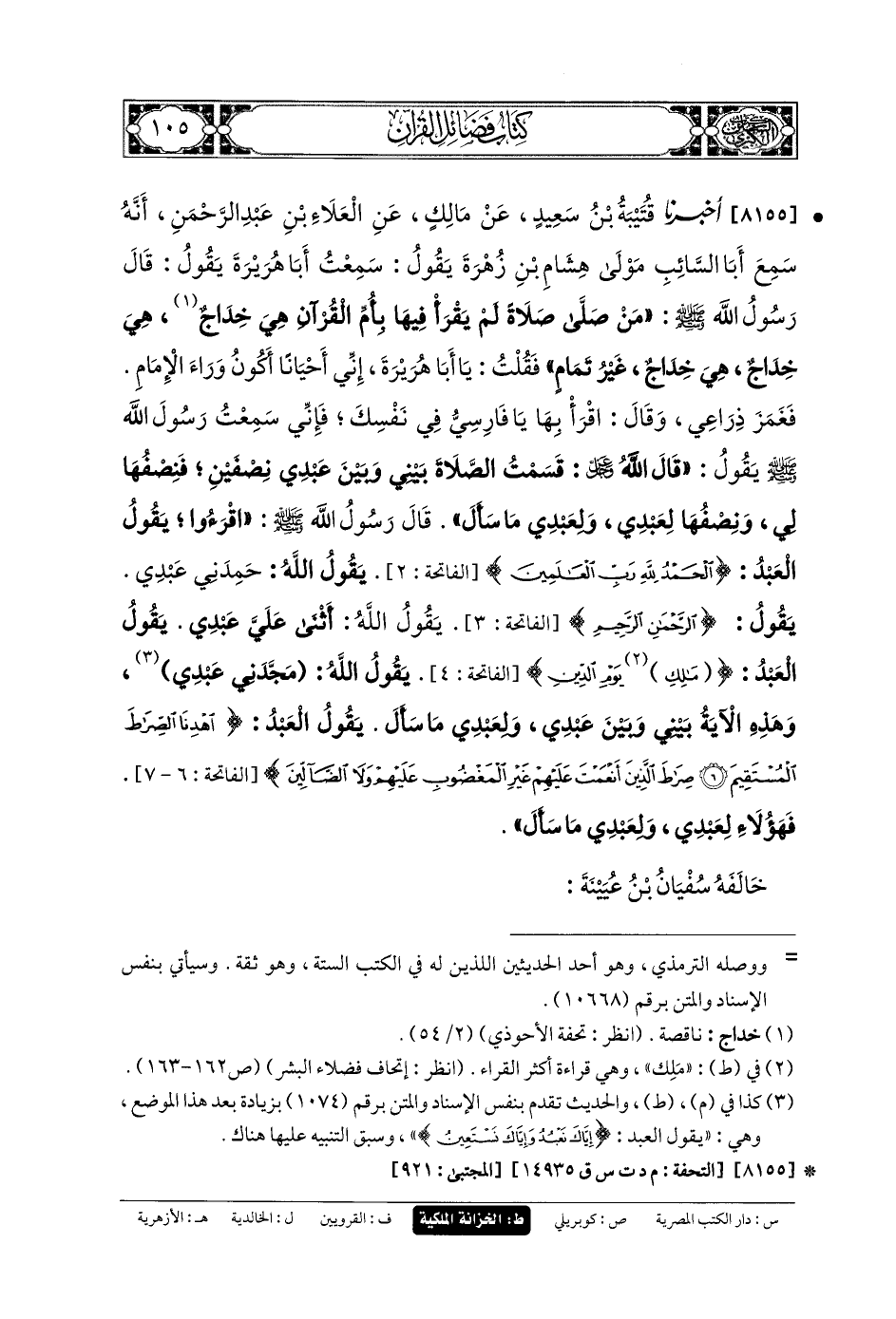 8155- أَخبَرنا قُتَيبَةُ بنُ سَعِيدٍ، عَن مَالِكٍ، عَنِ العَلاءِ بنِ عَبدِ الرَّحمَنِ، أَنَّهُ سَمِعَ أَبَا السَّائِبِ، مَوْلَى هِشَامِ بنِ زُهْرَةَ يَقُولُ: سَمِعْتُ أَبَا هُرَيْرَةَ يَقُولُ: قَالَ رَسُولُ اللهِ صَلى الله عَلَيهِ وسَلم: مَنْ صَلَّى صَلاةً لَمْ يَقْرَأْ فِيهَا بِأُمِّ القُرْآنِ هِيَ خِدَاجٌ، هِيَ خِدَاجٌ، هِيَ خِدَاجٌ، غَيْرُ تَمَامٍ، فَقُلْتُ: يَا أَبَا هُرَيْرَةَ، إِنِّي أَحْيَانًا أَكُونُ وَرَاءَ الإِمَامِ، فَغَمَزَ ذِرَاعِي، وَقَالَ: اقْرَأْ بِهَا يَا فَارِسِيُّ فِي نَفْسِكَ، فَإِنِّي سَمِعْتُ رَسُولَ اللهِ صَلى الله عَلَيهِ وسَلم يَقُولُ: قَالَ اللهُ عَزَّ وَجَلَّ: قَسَمْتُ الصَّلاةَ بَيْنِي وَبَيْنَ عَبدِي نِصْفَيْنِ، فَنِصْفُهَا لِي، وَنِصْفُهَا لِعَبدِي، وَلِعَبدِي مَا سَأَلَ، قَالَ رَسُولُ اللهِ صَلى الله عَلَيهِ وسَلم: اقْرَؤُوا، يَقُولُ العَبدُ: {الحَمْدُ للهِ رَبِّ العَالَمِينَ} يَقُولُ اللهُ: حَمِدَنِي عَبدِي، يَقُولُ: {الرَّحمَنِ الرَّحِيمِ} يَقُولُ اللهُ: أَثْنَى عَلَيَّ عَبدِي، يَقُولُ العَبدُ: {مَالِكِ يَوْمِ الدِّينِ} يَقُولُ اللهُ: مَجَّدَنِي عَبدِي، وَهَذِهِ الآيَةُ بَيْنِي وَبَيْنَ عَبدِي، وَلِعَبدِي مَا سَأَلَ، يَقُولُ العَبدُ: {اهْدِنَا الصِّرَاطَ المُسْتَقِيمَ صِرَاطَ الَّذِينَ أَنْعَمْتَ عَلَيْهِمْ غَيْرِ المَغْضُوبِ عَلَيْهِمْ وَلا الضَّالِّينَ} فَهَؤُلاءِ لِعَبدِي، وَلِعَبدِي مَا سَأَلَ.