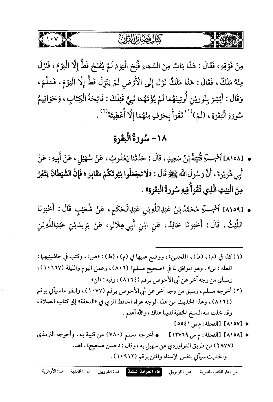 8158- أَخبَرنا قُتَيبَةُ بنُ سَعِيدٍ، قَالَ: حَدثنا يَعْقُوبُ، عَن سُهَيلٍ، عَن أَبيهِ، عَن أَبي هُرَيْرَةَ، أَنَّ رَسُولَ اللهِ صَلى الله عَلَيهِ وسَلم قَالَ: لا تَجْعَلُوا بُيُوتَكُمْ مَقَابِرَ، فَإِنَّ الشَّيْطَانَ يَنْفِرُ مِنَ البَيْتِ الَّذِي تُقْرَأُ فِيهِ سُورَةُ البَقَرَةِ.