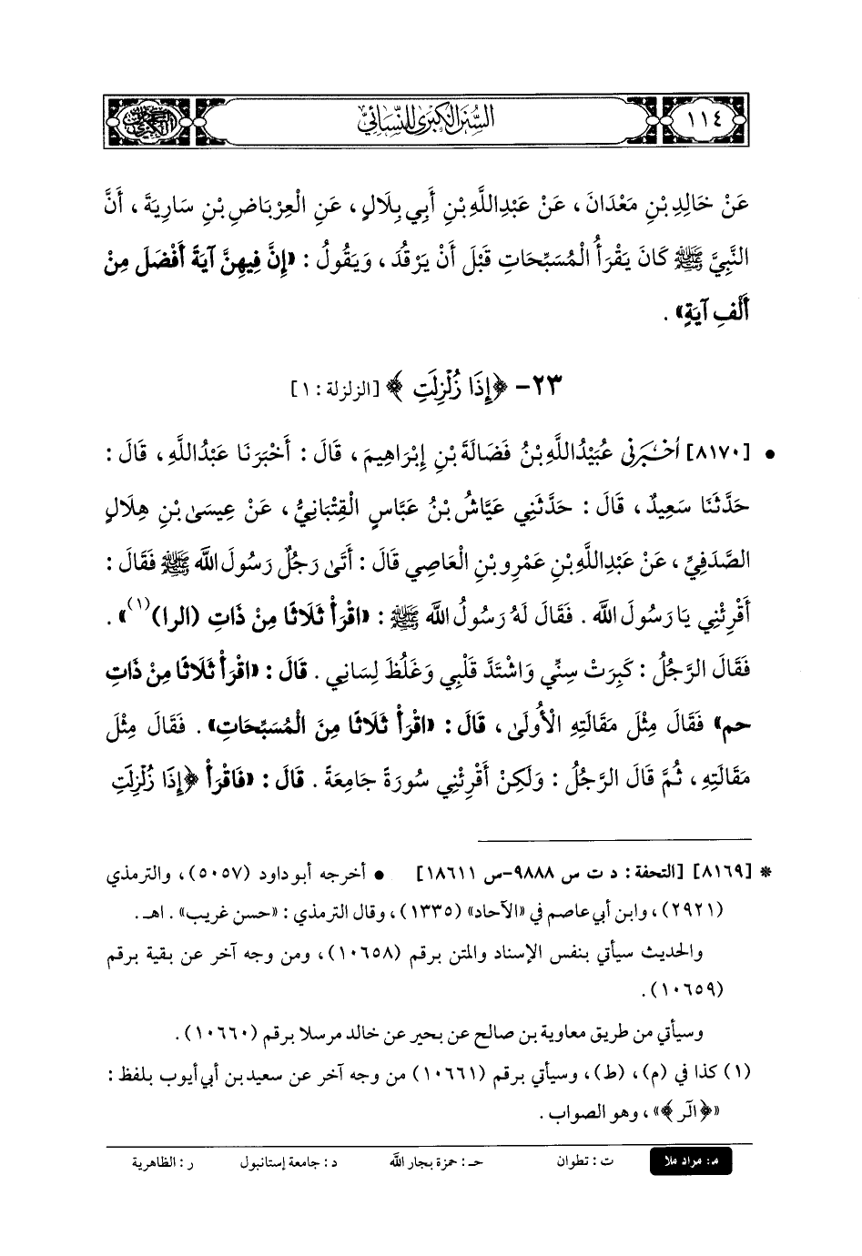 8170- أَخْبَرَنِي عُبَيدُ اللهِ بنُ فَضَالَةَ بنِ إِبْرَاهِيمَ، قَالَ: أَخبَرنا عَبدُ اللهِ، قَالَ: حَدثنا سَعِيدٌ، قَالَ: حَدَّثني عَيَّاشُ بنُ عَبَّاسٍ القِتْبَانِيُّ، عَن عِيسَى بنِ هِلالٍ الصَّدَفِيِّ، عَن عَبدِ اللهِ بنِ عَمْرِو بنِ العَاصي قَالَ: أَتَى رَجُلٌ رَسُولَ اللهِ صَلى الله عَلَيهِ وسَلم: فَقَالَ: أَقْرِئْنِي يَا رَسُولَ اللهِ، فَقَالَ لَهُ رَسُولُ اللهِ صَلى الله عَلَيهِ وسَلم: اقْرَأْ ثَلاثًا مِنْ ذَاتِ {الرا}، فَقَالَ الرَّجُلُ: كَبِرَتْ سِنِيَّ، وَاشْتَدَّ قَلْبِي، وَغَلُظَ لِسَانِي، قَالَ: اقْرَأْ ثَلاثًا مِنْ ذَاتِ حم، فَقَالَ مِثْلَ مَقَالَتِهِ الأُولَى، قَالَ: اقْرَأْ ثَلاثًا مِنَ المُسَبِّحَاتِ، فَقَالَ مِثْلَ مَقَالَتِهِ، ثُمَّ قَالَ الرَّجُلُ: وَلَكِنْ أَقْرِئْنِي سُورَةً جَامِعَةً، قَالَ: فَاقْرَأْ: {إِذَا زُلْزِلَتِ الأَرْضُ زِلْزَالَهَا} حَتَّى فَرَغَ مِنْهَا، فَقَالَ الرَّجُلُ: وَالَّذِي بَعَثَكَ بِالحَقِّ لا أَزِيدُ عَلَيْهَا شَيْئًا أَبَدًا، ثُمَّ أَدْبَرَ الرَّجُلُ، فَقَالَ رَسُولُ اللهِ صَلى الله عَلَيهِ وسَلم: أَفْلَحَ الرُّوَيْجِلُ، أَفْلَحَ الرُّوَيْجِلُ.