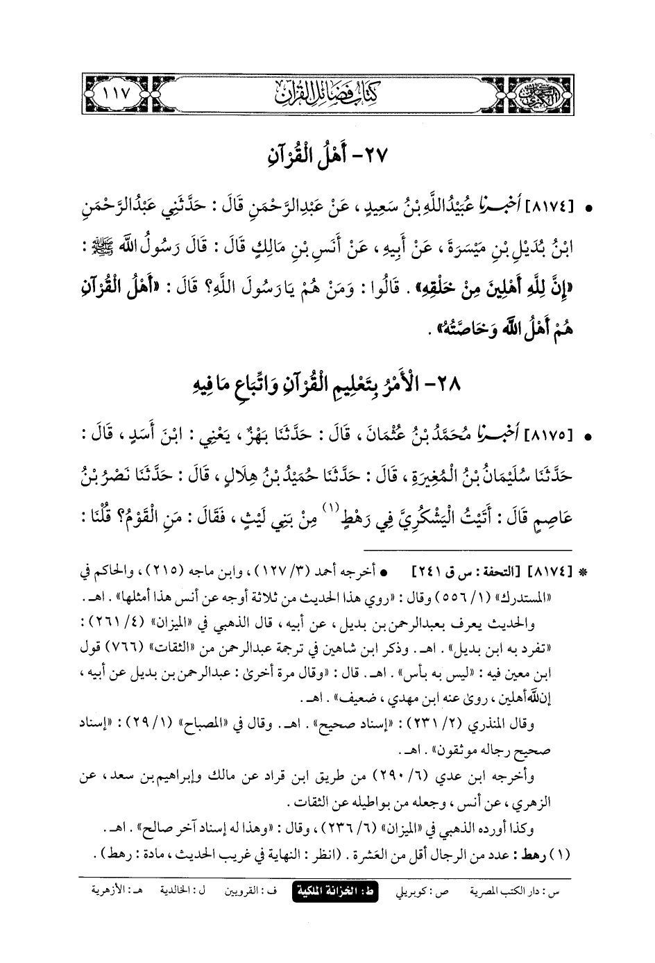 8174- أَخبَرنا عُبَيدُ اللهِ بنُ سَعِيدٍ، عَن عَبدِ الرَّحمَنِ، قَالَ: حَدَّثني عَبدُ الرَّحمَنِ بنُ بُدَيْلِ بنِ مَيْسَرَةَ، عَن أَبيهِ، عَن أَنَسِ بنِ مَالِكٍ قَالَ: قَالَ رَسُولُ اللهِ صَلى الله عَلَيهِ وسَلم: إِنَّ للهِ أَهْلِينَ مِنْ خَلْقِهِ، قَالُوا: وَمَنْ هُمْ يَا رَسُولَ اللهِ؟ قَالَ: أَهْلُ القُرْآنِ، هُمْ أَهْلُ اللهِ وَخَاصَّتُهُ.