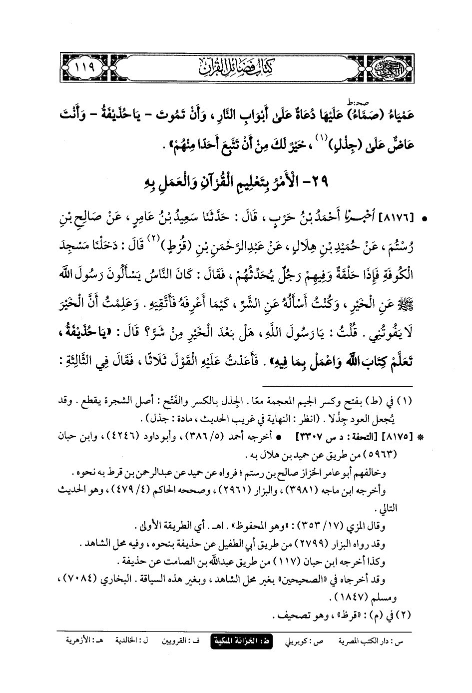 8176 - أَخبَرنا أَحْمَدُ بنُ حَرْبٍ، قَالَ: حَدثنا سَعِيدُ بنُ عَامِرٍ، عَن صَالِحِ بنِ رُسْتُمٍ، عَن حُمَيْدِ بنِ هِلالٍ، عَن عَبدِ الرَّحمَنِ بنِ قُرْطٍ قَالَ: دَخَلْنَا مَسْجِدَ الكُوفَةِ، فَإِذَا حَلْقَةٌ وَفِيهِمْ رَجُلٌ يُحَدِّثُهُمْ، فَقَالَ: كَانَ النَّاسُ يَسْأَلُونَ رَسُولَ اللهِ صَلى الله عَلَيهِ وسَلم عَنِ الخَيْرِ، وَكُنْتُ أَسْأَلُهُ عَنِ الشَّرِّ، كَيْمَا أَعْرِفَهُ فَأَتَّقِيَهُ، وَعَلِمْتُ أَنَّ الخَيْرَ لا يَفُوتَنِي، قُلْتُ: يَا رَسُولَ اللهِ، هَلْ بَعْدَ الخَيْرِ مِنْ شَرٍّ؟ قَالَ: يَا حُذَيْفَةُ، تَعَلَّمْ كِتَابَ اللهِ، وَاعْمَلْ بِمَا فِيهِ، فَأَعَدْتُ عَلَيْهِ القَوْلَ ثَلاثًا، فَقَالَ فِي الثَّالِثَةِ: فِتْنَةٌ وَاخْتِلافٌ، قُلْتُ: يَا رَسُولَ اللهِ، هَلْ بَعْدَ ذَلِكَ الشَّرِّ مِنْ خَيْرٍ؟ قَالَ: يَا حُذَيْفَةُ، تَعَلَّمْ كِتَابَ اللهِ وَاعْمَلْ بِمَا فِيهِ، ثَلاثًا، ثُمَّ قَالَ فِي الثَّالِثَةِ: هُدْنَةٌ عَلَى دَخَنٍ، وَجَمَاعَةٌ عَلَى قَذًى فِيهَا، قُلْتُ: يَا رَسُولَ اللهِ، هَلْ بَعْدَ ذَلِكَ الخَيْرِ مِنْ شَرٍّ؟ قَالَ: يَا حُذَيْفَةُ، تَعَلَّمْ كِتَابَ اللهِ وَاعْمَلْ بِمَا فِيهِ، ثَلاثًا، ثُمَّ قَالَ فِي الثَّالِثَةِ: فِتَنٌ عَلَى أَبْوَابِهَا دُعَاةٌ إِلَى النَّارِ، فَلأَنْ تَمُوتَ وَأَنْتَ عَاضٌّ عَلَى جِذْلٍ، خَيْرٌ لَكَ مِنْ أَنْ تَتَّبِعَ أَحَدًا مِنْهُمْ.