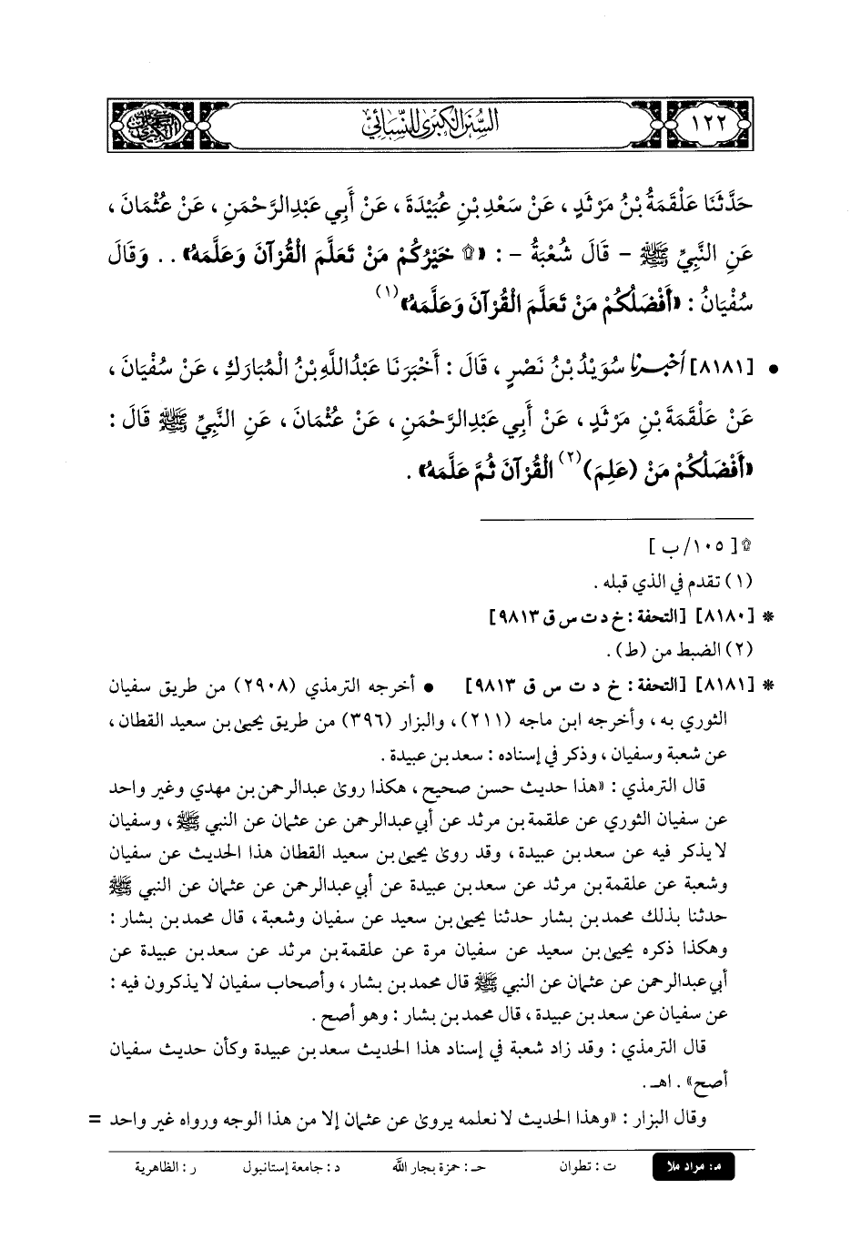 8181- أَخبَرنا سُوَيْدُ بنُ نَصْرٍ، قَالَ: أَخبَرنا عَبدُ اللهِ بنُ المُبَارَكِ، عَن سُفيانَ، عَن عَلْقَمَةَ بنِ مَرْثَدٍ، عَن أَبي عَبدِ الرَّحمَنِ، عَن عُثْمَانَ، عَنِ النَّبيِّ صَلى الله عَلَيهِ وسَلم قَالَ: أَفْضَلُكُمْ مَنْ عَلِمَ القُرْآنَ، ثُمَّ عَلَّمَهُ.