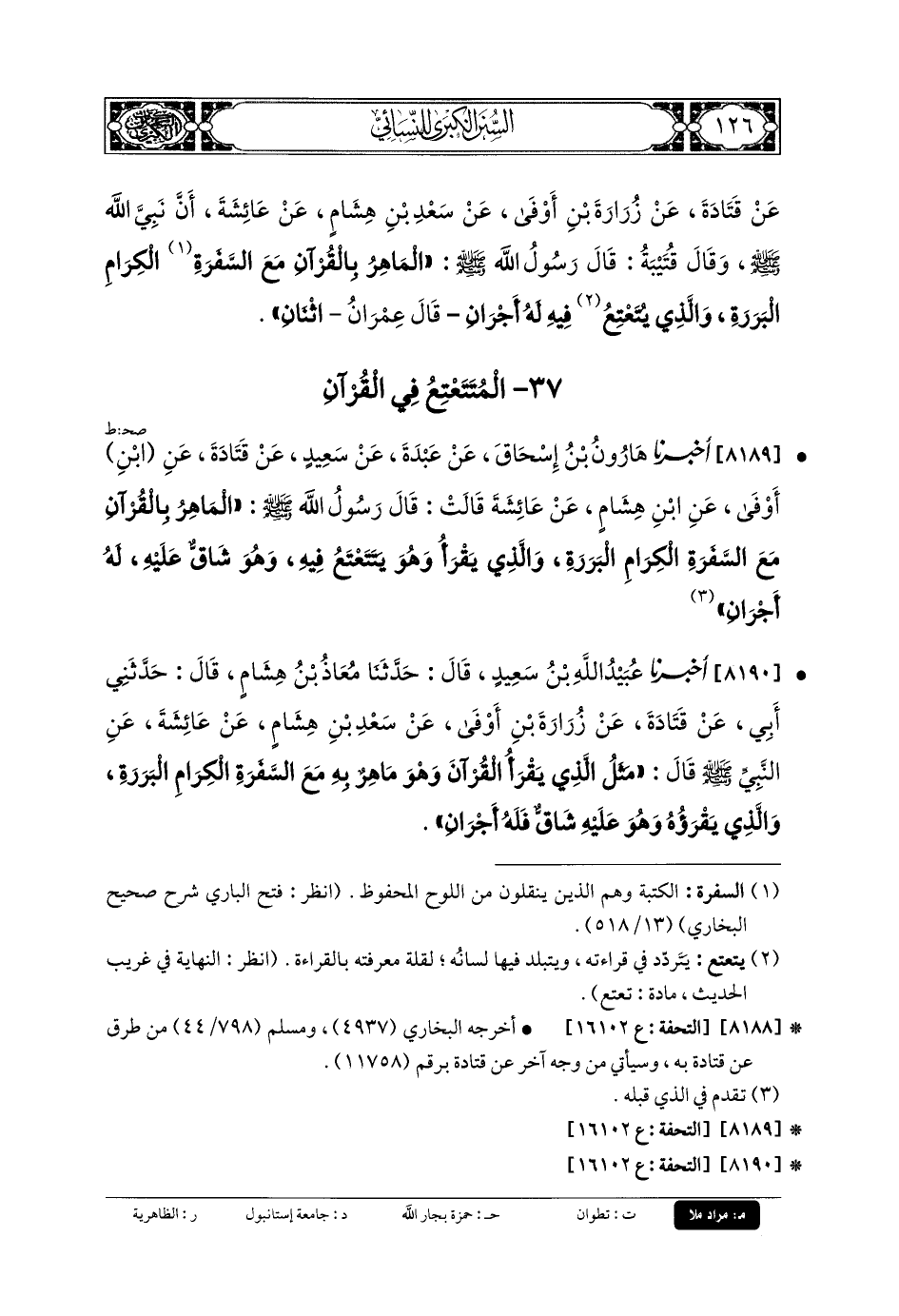 8190- أَخبَرنا عُبَيدُ اللهِ بنُ سَعِيدٍ، قَالَ: حَدثنا مُعَاذُ بنُ هِشَامٍ، قَالَ: حَدَّثني أَبي، عَن قَتَادَةَ، عَن زُرَارَةَ بنِ أَوْفَى، عَن سَعْدِ بنِ هِشَامٍ، عَن عَائِشَةَ، عَنِ النَّبيِّ صَلى الله عَلَيهِ وسَلم قَالَ: مَثَلُ الَّذِي يَقْرَأُ القُرْآنَ وَهُوَ مَاهِرٌ بِهِ مَعَ السَّفَرَةِ الكِرَامِ البَرَرَةِ، وَالَّذِي يَقْرَؤُهُ وَهُوَ عَلَيْهِ شَاقٌّ، فَلَهُ أَجْرَانِ.