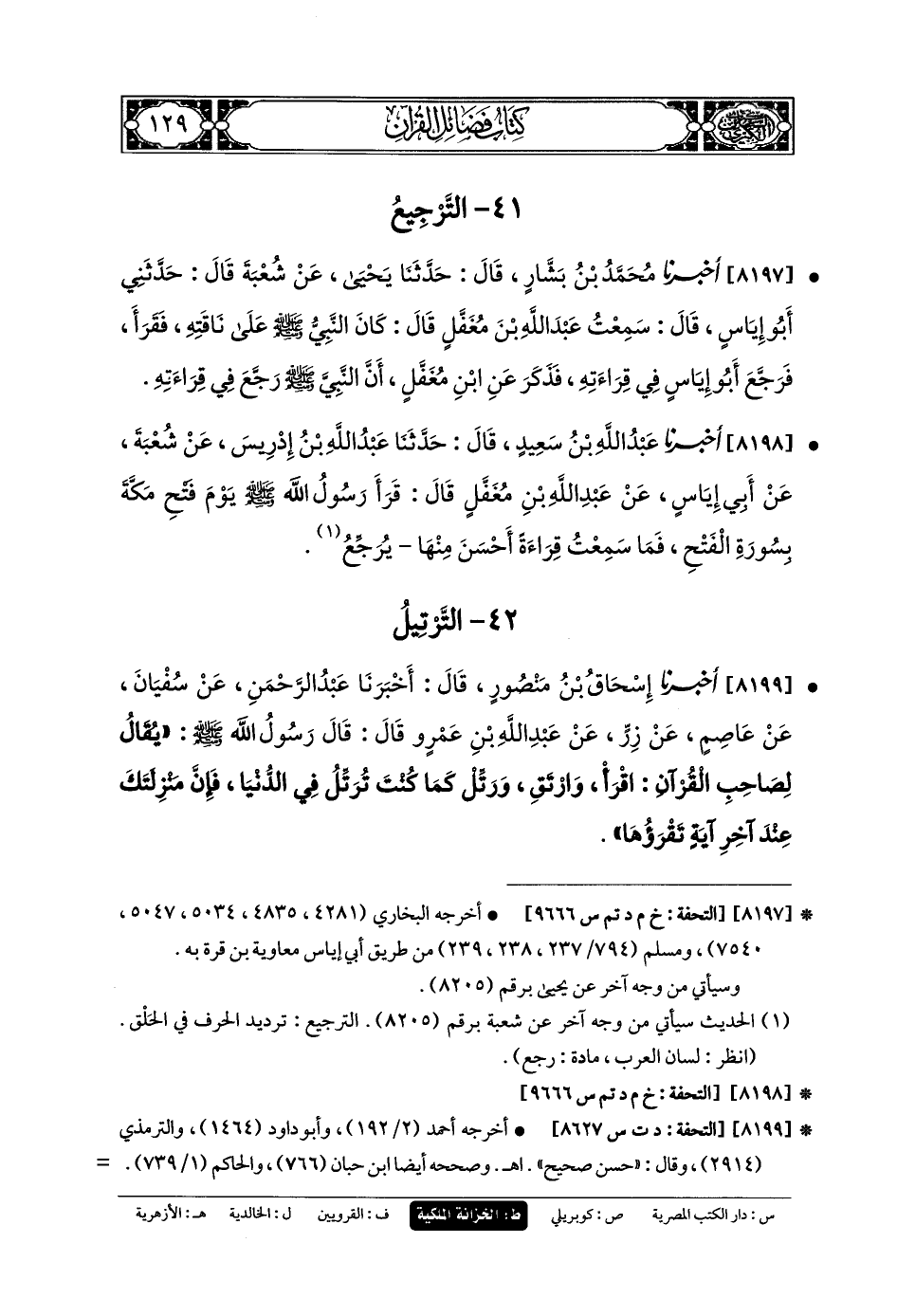 8198- أَخبَرنا عَبدُ اللهِ بنُ سَعِيدٍ، قَالَ: حَدثنا عَبدُ اللهِ بنُ إِدْرِيسَ، عَن شُعبَةَ، عَن أَبي إِيَاسٍ، عَن عَبدِ اللهِ بنِ مُغَفَّلٍ قَالَ: قَرَأَ رَسُولُ اللهِ صَلى الله عَلَيهِ وسَلم يَوْمَ فَتْحِ مَكَّةَ بِسُورَةِ الفَتْحِ، فَمَا سَمِعْتُ قِرَاءَةً أَحْسَنَ مِنْهَا يُرَجِّعُ.