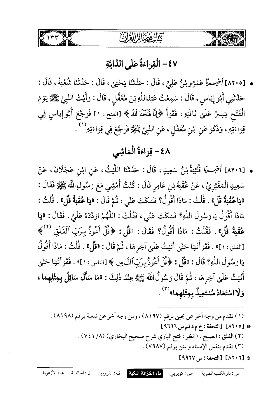 8206- أَخبَرنا قُتَيبَةُ بنُ سَعِيدٍ، قَالَ: حَدثنا اللَّيْثُ، عَنِ ابنِ عَجْلانَ، عَن سَعِيدٍ المَقْبُرِيِّ، عَن عُقْبَةَ بنِ عَامِرٍ قَالَ: كُنْتُ أَمْشِي مَعَ رَسُولِ اللهِ صَلى الله عَلَيهِ وسَلم فَقَالَ: يَا عُقْبَةُ، قُلْ: قُلْتُ: مَاذَا أَقُولُ؟ فَسَكَتَ عَنِّي، ثُمَّ قَالَ: يَا عُقْبَةُ، قُلْ: قُلْتُ: مَاذَا أَقُولُ يَا رَسُولَ اللهِ؟ فَسَكَتَ عَنِّي، فَقُلْتُ: اللهُمَّ ارْدُدْهُ عَلَيَّ، فَقَالَ: يَا عُقْبَةُ، قُلْ: فَقُلْتُ: مَاذَا أَقُولُ؟ فَقَالَ: {قُلْ أَعُوذُ بِرَبِّ الفَلَقِ} فَقَرَأْتُهَا حَتَّى آتَيْتُ عَلَى آخِرِهَا، ثُمَّ قَالَ: قُلْ: قُلْتُ: مَاذَا أَقُولُ يَا رَسُولَ اللهِ؟ قَالَ: {قُلْ أَعُوذُ بِرَبِّ النَّاسِ} فَقَرَأْتُهَا حَتَّى آتَيْتُ عَلَى آخِرِهَا، ثُمَّ قَالَ رَسُولُ اللهِ صَلى الله عَلَيهِ وسَلم عِنْدَ ذَلِكَ: مَا سَأَلَ سَائِلٌ بِمِثْلِهِمَا، وَلا اسْتَعَاذَ مُسْتَعِيذٌ بِمِثْلِهِمَا.