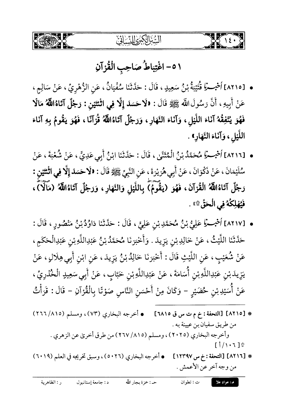 8215- أَخبَرنا قُتَيبَةُ بنُ سَعِيدٍ، قَالَ: حَدثنا سُفيانُ، عَنِ الزُّهْرِيِّ، عَن سَالِمٍ، عَن أَبيهِ، أَنَّ رَسُولَ اللهِ صَلى الله عَلَيهِ وسَلم قَالَ: لا حَسَدَ إِلاَّ فِي اثْنَتَيْنِ: رَجُلٌ آتَاهُ اللهُ مَالاً فَهُوَ يُنْفِقُهُ آنَاءَ اللَّيْلِ، وَآنَاءَ النَّهَارِ، وَرَجُلٌ آتَاهُ اللهُ قُرْآنًا فَهُوَ يَقُومُ بِهِ آنَاءَ اللَّيْلِ، وَآنَاءَ النَّهَارِ.