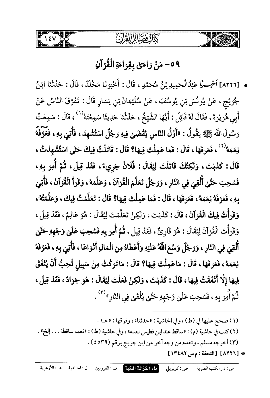8226- أَخبَرنا عَبدُ الحَمِيدِ بنِ مُحَمدِ، قَالَ: أَخبَرنا مَخْلَدٌ، قَالَ: حَدثنا ابنُ جُرَيْجٍ، عَن يُونُسَ بنِ يُوسُفَ، عَن سُلَيمَانَ بنِ يَسَارٍ قَالَ: تَفَرَّقَ النَّاسُ عَن أَبي هُرَيْرَةَ، فَقَالَ لَهُ قَائِلٌ: أَيُّهَا الشَّيْخُ، حَدِّثْنَا حَدِيثًا سَمِعْتَهُ، قَالَ: سَمِعْتُ رَسُولَ اللهِ صَلى الله عَلَيهِ وسَلم يَقُولُ: أَوَّلُ النَّاسِ يُقْضَى فِيهِ، رَجُلٌ اسْتُشْهِدَ، فَأُتِيَ بِهِ فَعَرَّفَهُ نِعَمَهُ فَعَرَفَهَا، قَالَ: فَمَا عَمِلْتَ فِيهَا؟ قَالَ: قَاتَلْتُ فِيكَ حَتَّى اسْتُشْهِدْتُ، قَالَ: كَذَبْتَ، وَلَكِنَّكَ قَاتَلْتَ لِيُقَالَ: فُلانٌ جَرِيءٌ، فَقَدْ قِيلَ: ثُمَّ أُمِرَ بِهِ فَسُحِبَ حَتَّى أُلْقِيَ فِي النَّارِ، وَرَجُلٌ تَعَلَّمَ القُرْآنَ وَعَلَّمَهُ، وَقَرَأَ القُرْآنَ فَأُتِيَ بِهِ فَعَرَّفَهُ نِعَمَهُ فَعَرَفَهَا، قَالَ: فَمَا عَمِلْتَ فِيهَا؟ قَالَ: تَعَلَّمْتُ فِيكَ وَعَلَّمْتُهُ، وَقَرَأْتُ فِيكَ القُرْآنَ، قَالَ: كَذَبْتَ، وَلَكِنْ تَعَلَّمْتَ لِيُقَالَ: هُوَ عَالِمٌ، فَقَدْ قِيلَ، وَقَرَأْتَ القُرْآنَ لِيُقَالَ: هُوَ قَارِئٌ، فَقَدْ قِيلَ، ثُمَّ أُمِرَ بِهِ فَسُحِبَ عَلَى وَجْهِهِ حَتَّى أُلْقِيَ فِي النَّارِ، وَرَجُلٌ وَسَّعَ اللهُ عَلَيْهِ وَأَعْطَاهُ مِنَ المَالِ أَنْوَاعًا، فَأُتِيَ بِهِ فَعَرَّفَهُ نِعَمَهُ فَعَرَفَهَا، قَالَ: مَا عَمِلْتَ فِيهَا؟ قَالَ: مَا تَرَكْتَ مِنْ سَبِيلٍ تُحِبُّ أَنْ يُنْفَقَ فِيهَا إِلاَّ أَنْفَقْتُ فِيهَا، قَالَ: كَذَبْتَ، وَلَكِنْ فَعَلْتَ لِيُقَالَ: هُوَ جَوَادٌ، فَقَدْ قِيلَ، ثُمَّ أُمِرَ بِهِ فَسُحِبَ عَلَى وَجْهِهِ حَتَّى يُلْقَى فِي النَّارِ.